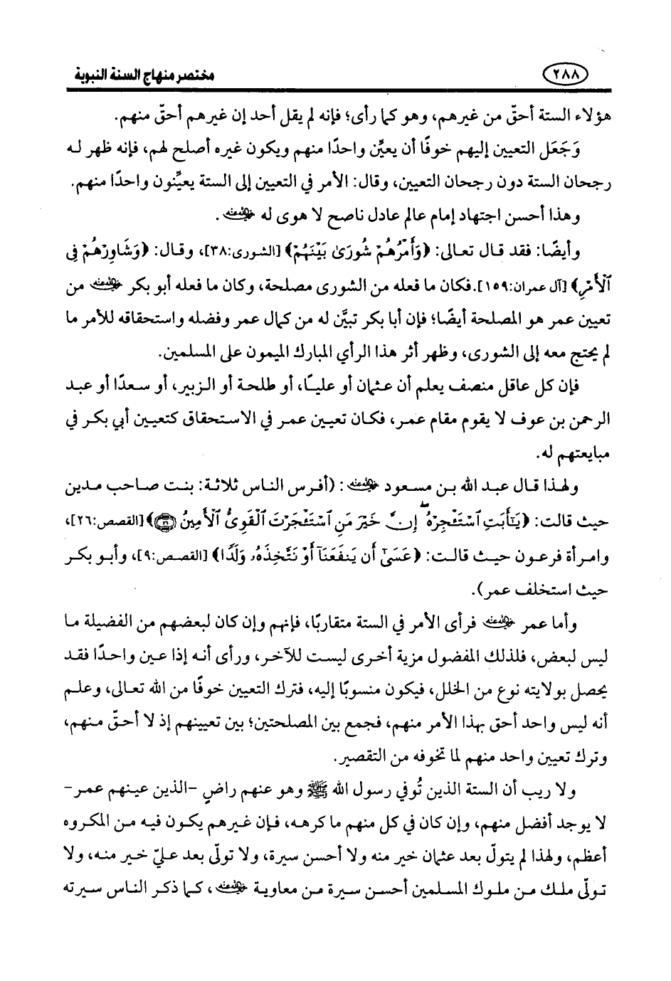 فَيُقَالُ لَهُ: أَوَّلًا: هَؤُلَاءِ كَانُوا مُتَقَارِبِينَ فِي الْفَضِيلَةِ، وَلَمْ يَكُنْ تَقَدُّمُ بَعْضِهِمْ عَلَى بَعْضٍ ظَاهِرًا، كَتَقَدُّمِ أَبِي بَكْرٍ وَعُمَرَ عَلَى الْبَاقِينَ. وَلِهَذَا كَانَ فِي الشُّورَى تَارَةً يُؤخذ بِرَأْيِ عُثْمَانَ، وتارة يؤخذ برأي علي، وتارة يؤخذ بِرَأْيِ عَبْدِ الرَّحْمَنِ. وَكُلٌّ مِنْهُمْ لَهُ فَضَائِلُ لَمْ يُشْرِكْهُ فِيهَا الْآخَرُ.