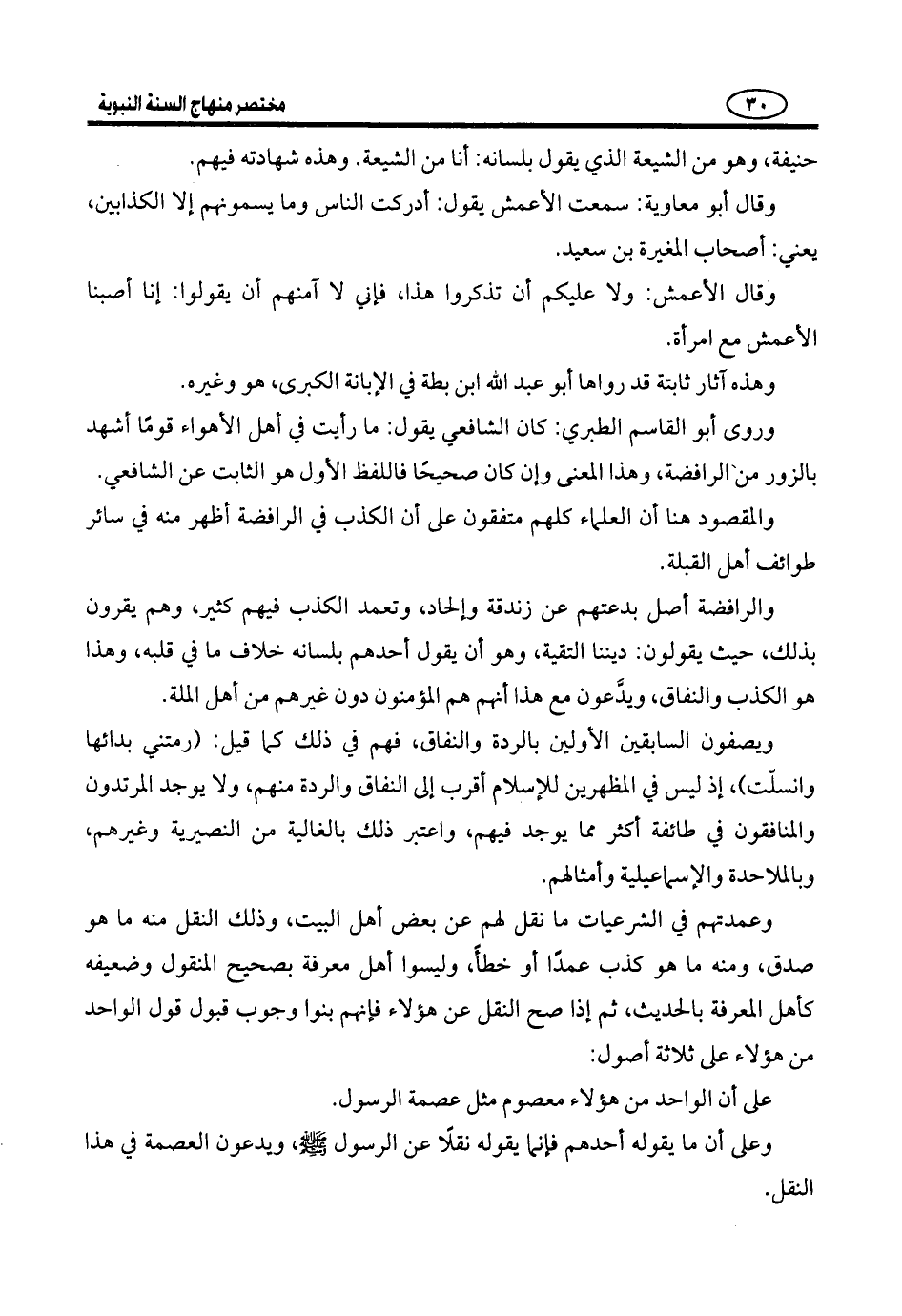 قَالَ الْمُصَنِّفُ الرَّافِضِيُّ أَمَّا بَعْدُ: فَهَذِهِ رِسَالَةٌ شريفة، ومقالة لطيفة اشتملت على أهم المطالب في أحكام الدين، وأشرف مسائل الْمُسْلِمِينَ وَهِيَ مَسْأَلَةُ الْإِمَامَةِ، الَّتِي يَحْصُلُ بِسَبَبِ إِدْرَاكِهَا نَيْلُ دَرَجَةِ الْكَرَامَةِ، وَهِيَ أَحَدُ أَرْكَانِ الْإِيمَانِ، الْمُسْتَحَقِّ بِسَبَبِهِ الْخُلُودُ فِي الْجِنَانِ، وَالتَّخَلُّصُ من غضب الرحمن، فلقد قَالَ رَسُولُ اللَّهِ - صَلَّى اللَّهُ عَلَيْهِ وَسَلَّمَ -: ((مَنْ مَاتَ وَلَمْ يَعْرِفْ إِمَامَ زَمَانِهِ مَاتَ مِيتَةً جَاهِلِيَّةً)) . خَدَمْتُ بِهَا خِزَانَةَ السُّلْطَانِ الْأَعْظَمِ مَالِكِ رِقَابِ الْأُمَمِ، مَلِكِ مُلُوكِ طَوَائِفِ الْعَرَبِ وَالْعَجَمِ، مَوْلَى النِّعَمِ وَمُسْدِي الْخَيْرِ وَالْكَرْمِ، شَاهِنْشَاهِ المكرم غياث الملة والحق والدين (أولجايو خَدَابَنْدَهْ) ، قَدْ لَخَّصْتُ فِيهِ خُلَاصَةَ الدَّلَائِلِ، وَأَشَرْتُ إلى رؤوس الْمَسَائِلِ، وَسَمَّيْتُهَا مِنْهَاجَ الْكَرَامَةِ، فِي مَعْرِفَةِ الْإِمَامَةِ، وقد رتبتها عَلَى فُصُولٍ. الْفَصْلُ الْأَوَّلُ فِي نَقْلِ الْمَذَاهِبِ فِي هَذِهِ الْمَسْأَلَةِ، ثُمَّ ذَكَرَ الْفَصْلَ الثَّانِيَ في أن مذهب الإمامية واجب الِاتِّبَاعِ، ثُمَّ ذَكَرَ الْفَصْلَ الثَّالِثَ فِي الْأَدِلَّةِ عَلَى إِمَامَةِ عَلِيٍّ - رَضِيَ اللَّهُ عَنْهُ - بَعْدَ رسول