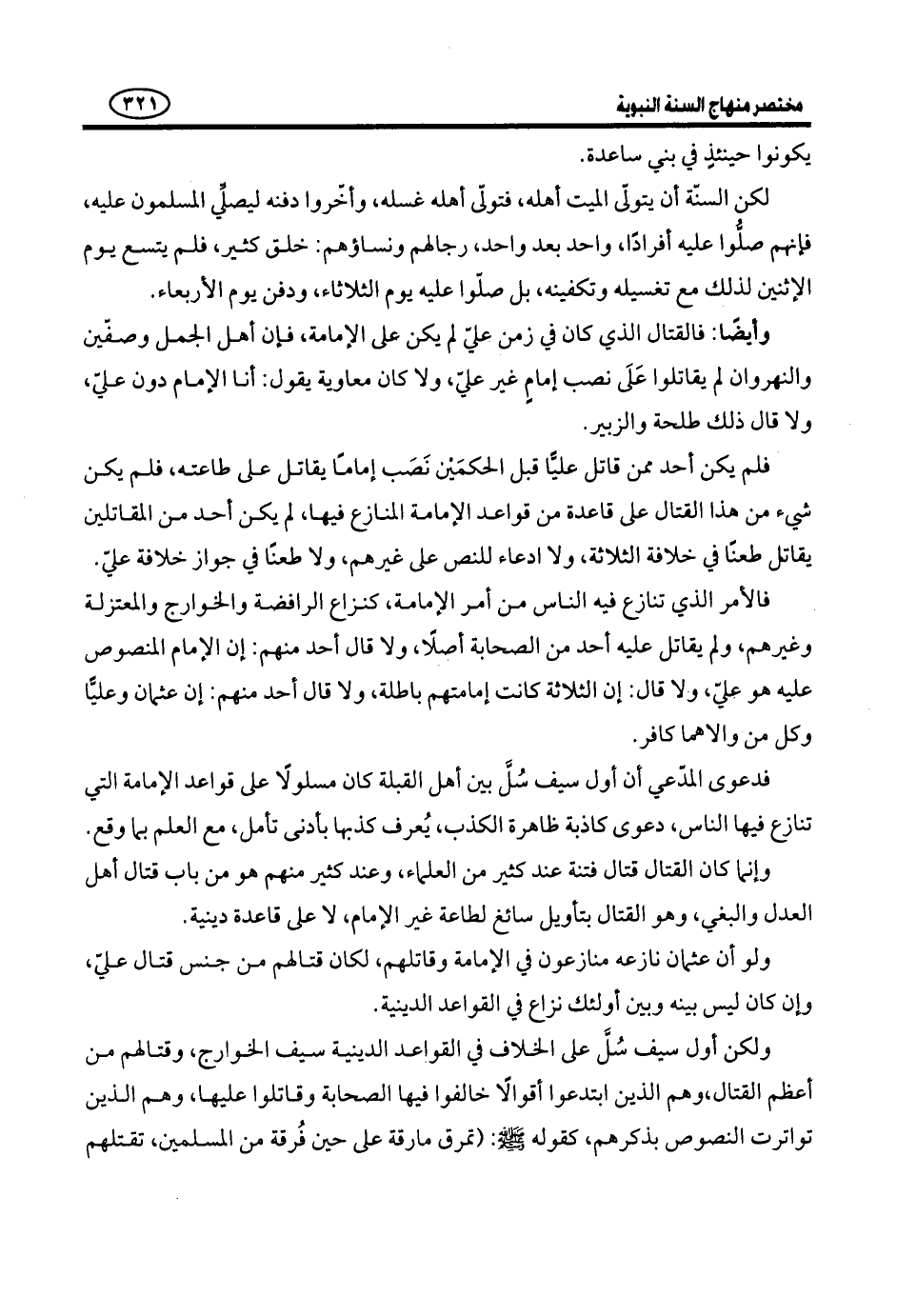 وَعَلِيٌّ رَضِيَ اللَّهُ عَنْهُ لَمْ يُقَاتِلْ أَحَدًا عَلَى إِمَامَةِ مَنْ قَاتَلَهُ، وَلَا قَاتَلَهُ أحدٌ عَلَى إِمَامَتِهِ نَفْسِهِ، وَلَا ادَّعَى أحدٌ قَطُّ فِي زَمَنِ خِلَافَتِهِ أَنَّهُ أحقُّ بِالْإِمَامَةِ مِنْهُ: لَا عَائِشَةَ، وَلَا طَلْحَةَ، وَلَا الزُّبَيْرَ، وَلَا مُعَاوِيَةَ وَأَصْحَابَهُ، وَلَا الْخَوَارِجَ، بَلْ كُلُّ الْأُمَّةِ كَانُوا مُعْتَرِفِينَ بِفَضْلِ عَلِيٍّ وسابقته بعد قتل عُثْمَانَ، وَأَنَّهُ لَمْ يَبْقَ فِي الصَّحَابَةِ مَنْ يُمَاثِلُهُ فِي زَمَنِ خِلَافَتِهِ، كَمَا كَانَ عُثْمَانُ كَذَلِكَ: لَمْ يُنَازِعْ قَطُّ أحدٌ مِنَ الْمُسْلِمِينَ فِي إِمَامَتِهِ وَخِلَافَتِهِ، وَلَا تَخَاصَمَ اثْنَانِ فِي أَنَّ غَيْرَهُ أَحَقُّ بِالْإِمَامَةِ مِنْهُ، فَضْلًا عَنِ الْقِتَالِ عَلَى ذَلِكَ. وَكَذَلِكَ أَبُو بَكْرٍ وَعُمَرُ رَضِيَ اللَّهُ عَنْهُمَا.
