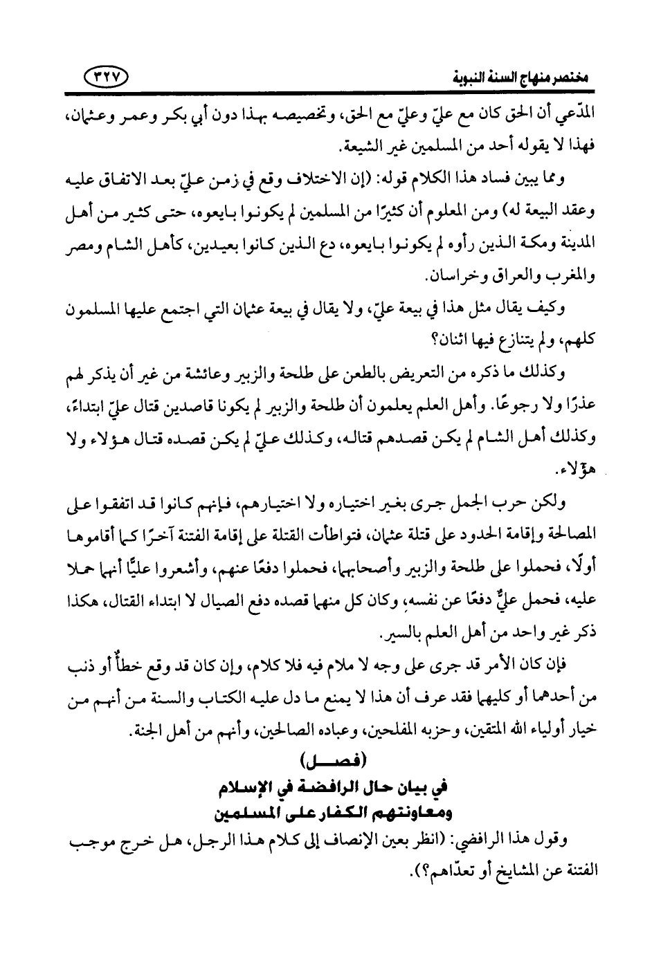 فَالْجَوَابُ: أَنْ يُقال: أَمَّا الْفِتْنَةُ فَإِنَّمَا ظَهَرَتْ فِي الْإِسْلَامِ مِنَ الشِّيعَةِ، فَإِنَّهُمْ أَسَاسُ كُلِّ فِتْنَةٍ وَشَرٍّ، وَهُمْ قُطْبُ رَحَى الْفِتَنِ، فَإِنَّ أَوَّلَ فِتْنَةٍ كَانَتْ فِي الْإِسْلَامِ قَتْلُ عُثْمَانَ.