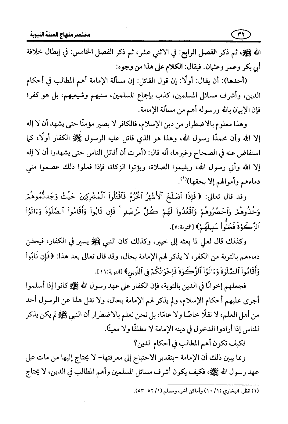 وَمِنَ الْمَعْلُومِ أَنَّهُ لَيْسَ بَيَانُ مَسْأَلَةِ الْإِمَامَةِ في الكتاب والسنة ببيان هَذِهِ الْأُصُولِ، فَإِنْ قِيلَ بَلِ الْإِمَامَةُ فِي كُلِّ زَمَانٍ هِيَ الْأَهَمُّ وَالنَّبِيُّ - صَلَّى اللَّهُ عَلَيْهِ وَسَلَّمَ - كَانَ نَبِيًّا إِمَامًا وَهَذَا كَانَ مَعْلُومًا لِمَنْ آمَنَ بِهِ أَنَّهُ كَانَ إِمَامَ ذَلِكِ الزَّمَانِ قِيلَ الِاعْتِذَارُ بِهَذَا بَاطِلٌ مِنْ وجوه:
