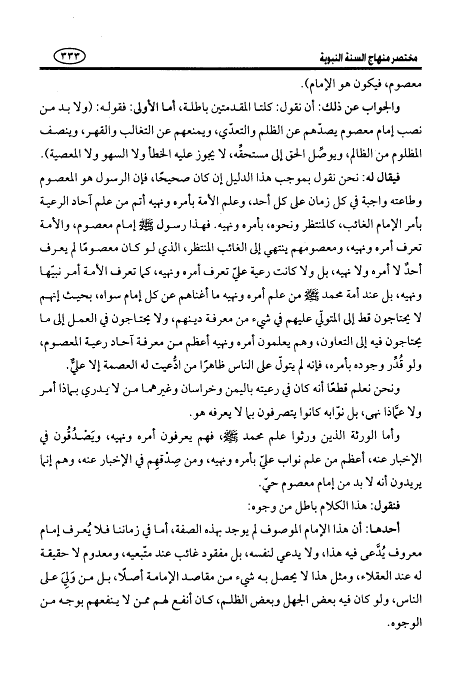 وَهَؤُلَاءِ الْمُنْتَسِبُونَ إِلَى الْإِمَامِ الْمَعْصُومِ لَا يُوجَدُونَ مُسْتَعِينِينَ فِي أُمُورِهِمْ إِلَّا بِغَيْرِهِ، بَلْ هُمْ يَنْتَسِبُونَ إِلَى الْمَعْصُومِ، وَإِنَّمَا يَسْتَعِينُونَ بِكَفُورٍ أَوْ ظَلُومٍ. فَإِذَا كَانَ المصدِّقون لِهَذَا الْمَعْصُومِ الْمُنْتَظَرِ لم ينتفع به أحد مِنْهُمْ لَا فِي دِينِهِ وَلَا فِي دُنْيَاهُ، لَمْ يَحْصُلْ لِأَحَدٍ بِهِ شَيْءٌ مِنْ مَقَاصِدِ الْإِمَامَةِ.