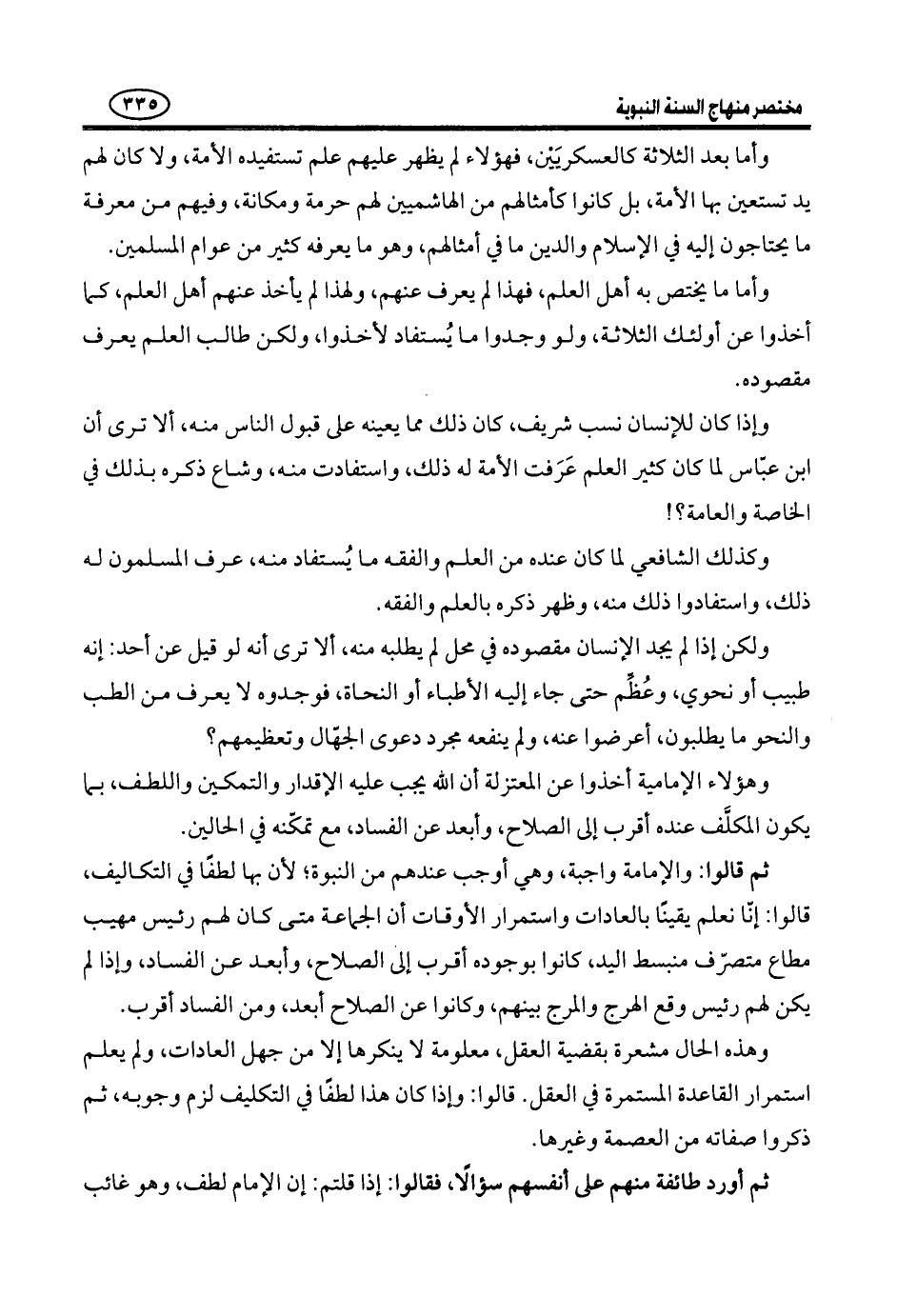فَيُقَالُ لَهُمْ: هَذَا كَلَامٌ ظَاهِرُ الْبُطْلَانِ. وَذَلِكَ أَنَّ الْإِمَامَ الَّذِي جَعَلْتُمُوهُ لُطْفًا، هُوَ مَا شَهِدَتْ بِهِ الْعُقُولُ وَالْعَادَاتُ، وَهُوَ مَا ذَكَرْتُمُوهُ. قُلْتُمْ: إِنَّ الْجَمَاعَةَ مَتَى كَانَ لَهُمْ رَئِيسٌ مَهِيبٌ مُطَاعٌ متصرِّف مُنْبَسِطُ الْيَدِ، كَانُوا بِوُجُودِهِ أقرب إلى الصلاح، وأبد عَنِ الْفَسَادِ، وَاشْتَرَطْتُمْ فِيهِ الْعِصْمَةَ. قُلْتُمْ: لِأَنَّ مَقْصُودَ الِانْزِجَارِ لَا يَحْصُلُ إِلَّا بِهَا. وَمِنَ الْمَعْلُومِ أَنَّ الْمَوْجُودِينَ الَّذِينَ كَانُوا قَبْلَ الْمُنْتَظَرِ، لَمْ يَكُنْ أَحَدٌ مِنْهُمْ بِهَذِهِ الصِّفَةِ: لَمْ يَكُنْ أَحَدٌ مِنْهُمْ مُنْبَسِطَ الْيَدِ وَلَا مُتَصَرِّفًا.