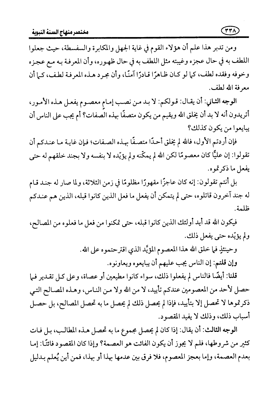 فَإِنَّهُ بِتَقْدِيرِ أَنْ لَا يَكُونَ عَلِيٌّ رَضِيَ اللَّهُ عَنْهُ مَعْصُومًا، وَلَا بَقِيَّةُ الِاثْنَيْ عَشَرَ وَنَحْوِهُمْ، لَا يَكُونُ مَا وَقَعَ مِنْ تَوْلِيَةِ الثَّلَاثَةِ، وَبَنِي أُمَيَّةَ، وَبَنِي الْعَبَّاسِ، فِيهِ مِنَ الظُّلْمِ وَالشَّرِّ مَا فِيهِ، بِتَقْدِيرِ كَوْنِهِمْ أَئِمَّةً مَعْصُومِينَ. وَبِتَقْدِيرِ كَوْنِهِمْ مَعْصُومِينَ فَمَا أَزَالُوا مِنَ الشَّرِّ إِلَّا مَا يُزِيلُهُ مَنْ لَيْسَ بِمَعْصُومٍ، فَصَارَ كَوْنُهُمْ مَعْصُومِينَ إِنَّمَا حَصَلَ بِهِ الشَّرُّ لَا الْخَيْرُ.