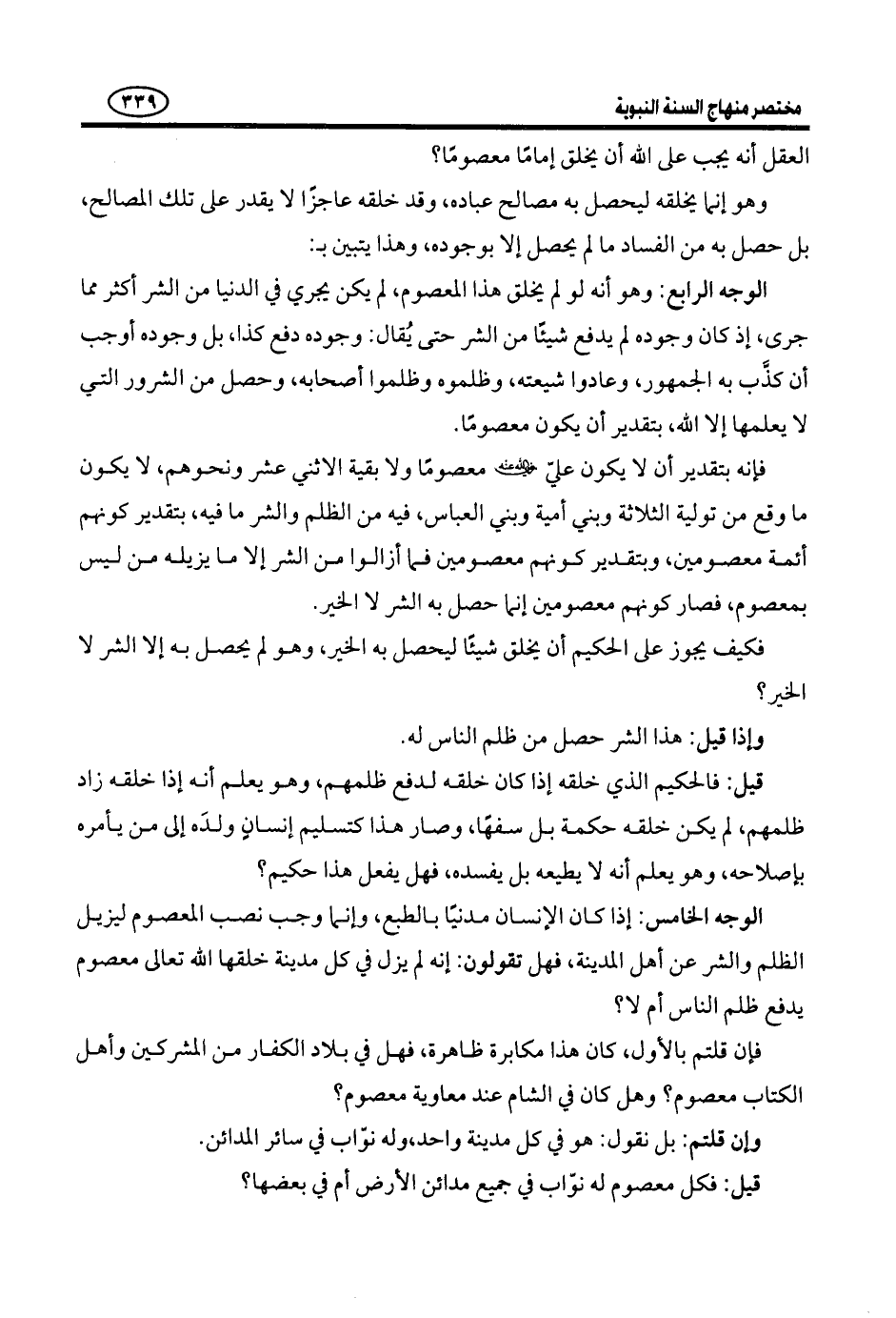 الْوَجْهُ السَّادِسُ: أَنْ يُقال: هَذَا الْمَعْصُومُ يَكُونُ وَحْدَهُ مَعْصُومًا؟ أَوْ كلٌّ مِنْ نُوَّابِهِ مَعْصُومًا؟ وَهُمْ لَا يَقُولُونَ بِالثَّانِي، وَالْقَوْلُ بِهِ مُكَابَرَةٌ. فَإِنَّ نُوَّابَ النَّبِيِّ - صَلَّى اللَّهُ عَلَيْهِ وَسَلَّمَ - لَمْ يَكُونُوا مَعْصُومِينَ، وَلَا نُوَّابَ عَلِيٍّ، بَلْ كَانَ فِي بَعْضِهِمْ مِنَ الشَّرِّ وَالْمَعْصِيَةِ ما لم يكن مثله في نواب معاوية لِأَمِيرِهِمْ، فَأَيْنَ الْعِصْمَةُ؟
