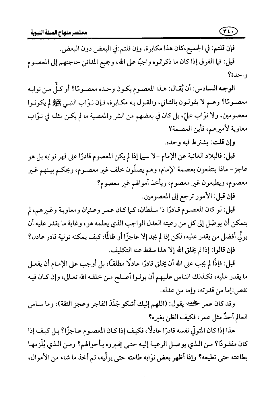 فَعُلِمَ أَنَّ الْمَعْصُومَ الْوَاحِدَ لَا يَحْصُلُ بِهِ الْمَقْصُودُ، إِذَا كَانَ ذَا سُلْطَانٍ، فَكَيْفَ إِذَا كَانَ عَاجِزًا مَقْهُورًا؟ فَكَيْفَ إِذَا كَانَ مَفْقُودًا غَائِبًا لَا يُمْكِنُهُ مُخَاطَبَةُ أَحَدٍ؟ فَكَيْفَ إِذَا كَانَ مَعْدُومًا لَا حَقِيقَةَ لَهُ؟