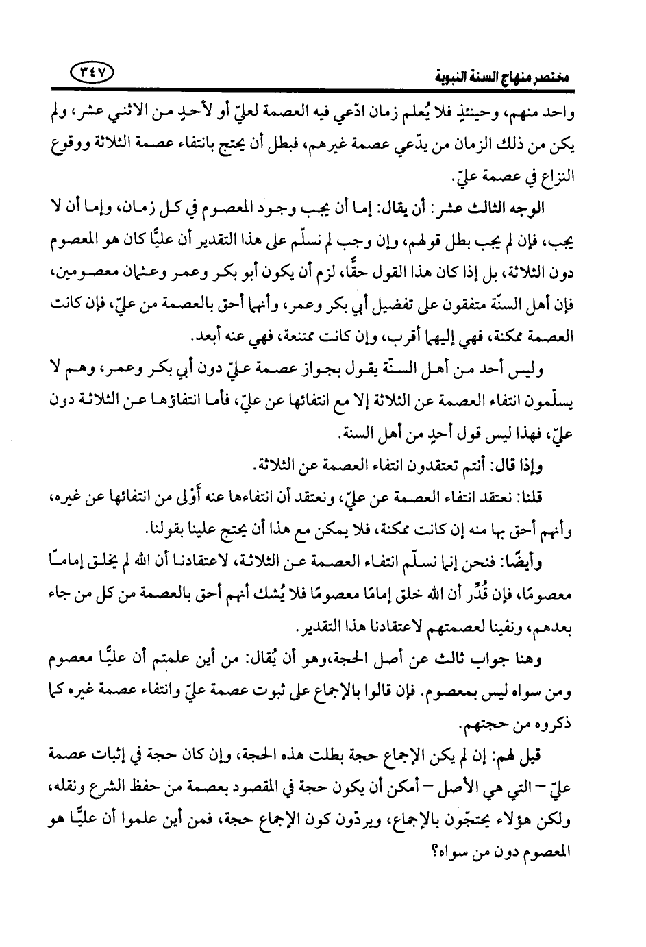 وَمَعَ هَذَا كُلِّهِ بِتَقْدِيرِ دَعْوَى عَلِيٍّ الْعِصْمَةَ، فَإِنَّمَا يُقبل هَذَا لَوْ كَانَ عَلِيٌّ قَالَ ذَلِكَ، وَحَاشَاهُ مِنْ ذَلِكَ.