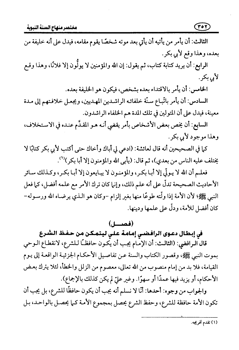 الْوَجْهُ الثَّانِي: أَنْ يُقَالَ: أَتُرِيدُ بِهِ مَنْ يَكُونُ حَافِظًا لِلشَّرْعِ وَإِنْ لَمْ يَكُنْ مَعْصُومًا؟ أَوْ مَنْ يَكُونُ مَعْصُومًا؟ فَإِنِ اشْتَرَطَتِ الْعِصْمَةَ فَهَذَا من الْوَجْهُ الْأَوَّلُ، وَقَدْ كَرَّرْتُهُ، وَتَقَدَّمَ الْجَوَابُ عَلَيْهِ. وَإِنِ اشْتَرَطَتْ مُجَرَّدَ الْحِفْظِ، فَلَا نُسَلِّمُ أَنَّ عَلِيًّا كَانَ أَحْفَظَ لِلْكِتَابِ وَالسُّنَّةِ، وَأَعْلَمُ بِهِمَا مِنْ أَبِي بَكْرٍ وَعُمَرَ، بَلْ هَمَا كَانَا أَعْلَمَ بِالْكِتَابِ وَالسُّنَّةِ مِنْهُ، فَبَطَلَ مَا ادَّعَاهُ مِنَ الْإِجْمَاعِ.