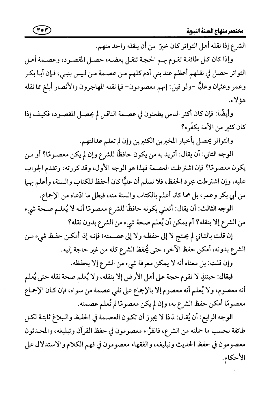 قِيلَ: فَإِذَا كَانَ تَوَاتُرُ أَصْحَابِكُمْ عَنِ الْأَئِمَّةِ يُوجِبُ حِفْظَ الشَّرْعِ وَنَقْلَهُ، فَلِمَاذَا لَا يَجُوزُ أَنْ يَكُونَ تَوَاتُرُ الْأُمَّةِ كُلِّهَا عَنْ نَبِيِّهَا أَوْلى بِحِفْظِ الشَّرْعِ وَنَقْلِهِ، مِنْ غَيْرِ احْتِيَاجٍ إِلَى نَقْلِ وَاحِدٍ عَنْ واحد؟