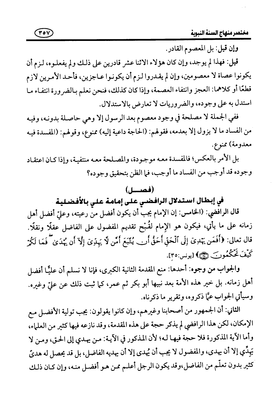 وَأَمَّا أَهْلُ السُّنَّةِ فَلَا يَحْتَاجُونَ إِلَى مَنْعِ هَذِهِ الْمُقَدِّمَةِ، بَلِ الصدِّيق عِنْدَهُمْ أَفْضَلُ الْأُمَّةِ. لَكِنَّ الْمَقْصُودَ أَنْ نُبَيِّنَ أَنَّ الرَّافِضَةَ، وَإِنْ قَالُوا حَقًّا، فَلَا يَقْدِرُونَ أَنْ يدلُّوا عَلَيْهِ بِدَلِيلٍ صَحِيحٍ، لِأَنَّهُمْ سدُّوا عَلَى أَنْفُسِهِمْ كَثِيرًا مِنْ طُرُقِ الْعِلْمِ، فَصَارُوا عَاجِزِينَ عن بيان الحق، حتى أنهم لَا يُمْكِنُهُمْ تَقْرِيرُ إِيمَانِ عَلِيٍّ عَلَى الْخَوَارِجِ، وَلَا تَقْرِيرُ إِمَامَتِهِ عَلَى الْمَرْوَانِيَّةِ، وَمَنْ قَاتَلَهُ فإن ما يستدل به على ذلك فقد أَطْلَقَ جِنْسَهُ عَلَى أَنْفُسِهِمْ، لِأَنَّهُمْ لَا يَدْرُونَ مَا يَلْزَمُ أَقْوَالَهُمُ الْبَاطِلَةَ مِنَ التَّنَاقُضِ وَالْفَسَادِ، لقوة جهلهم، واتباعهم الهوى بغير علم.