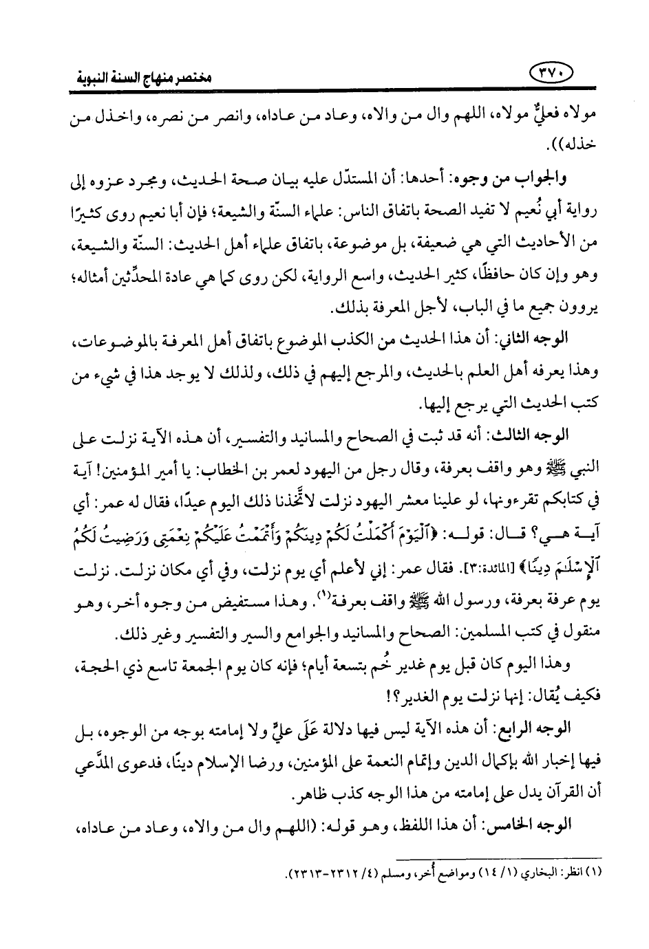 وأما قو له: ((مَنْ كُنْتُ مَوْلَاهُ فعليٌّ مَوْلَاهُ)) فَلَهُمْ فِيهِ قولان: وسنذكره إن شاء الله تعالى فِي مَوْضِعِهِ.