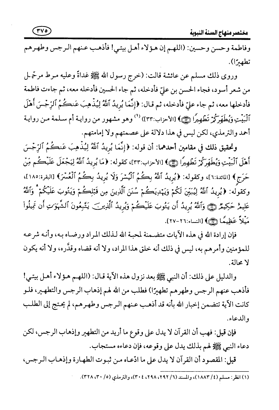 وَبِالْجُمْلَةِ فَالتَّطْهِيرُ الَّذِي أَرَادَهُ اللَّهُ، وَالَّذِي دَعَا بِهِ النَّبِيُّ - صَلَّى اللَّهُ عَلَيْهِ وَسَلَّمَ - لَيْسَ هُوَ الْعِصْمَةُ بِالِاتِّفَاقِ، فَإِنَّ أَهْلَ السُّنَّةِ عِنْدَهُمْ لا معصوم إلا النبي - صلى الله عليه وَسَلَّمَ -. وَالشِّيعَةُ يَقُولُونَ: لَا مَعْصُومَ غَيْرُ النَّبِيِّ - صَلَّى اللَّهُ عَلَيْهِ وَسَلَّمَ - وَالْإِمَامِ. فَقَدْ وَقَعَ الِاتِّفَاقُ عَلَى انْتِفَاءِ الْعِصْمَةِ الْمُخْتَصَّةِ بِالنَّبِيِّ - صَلَّى اللَّهُ عَلَيْهِ وَسَلَّمَ - وَالْإِمَامِ عَنْ أَزْوَاجِهِ وَبَنَاتِهِ وغيرهن من النساء.