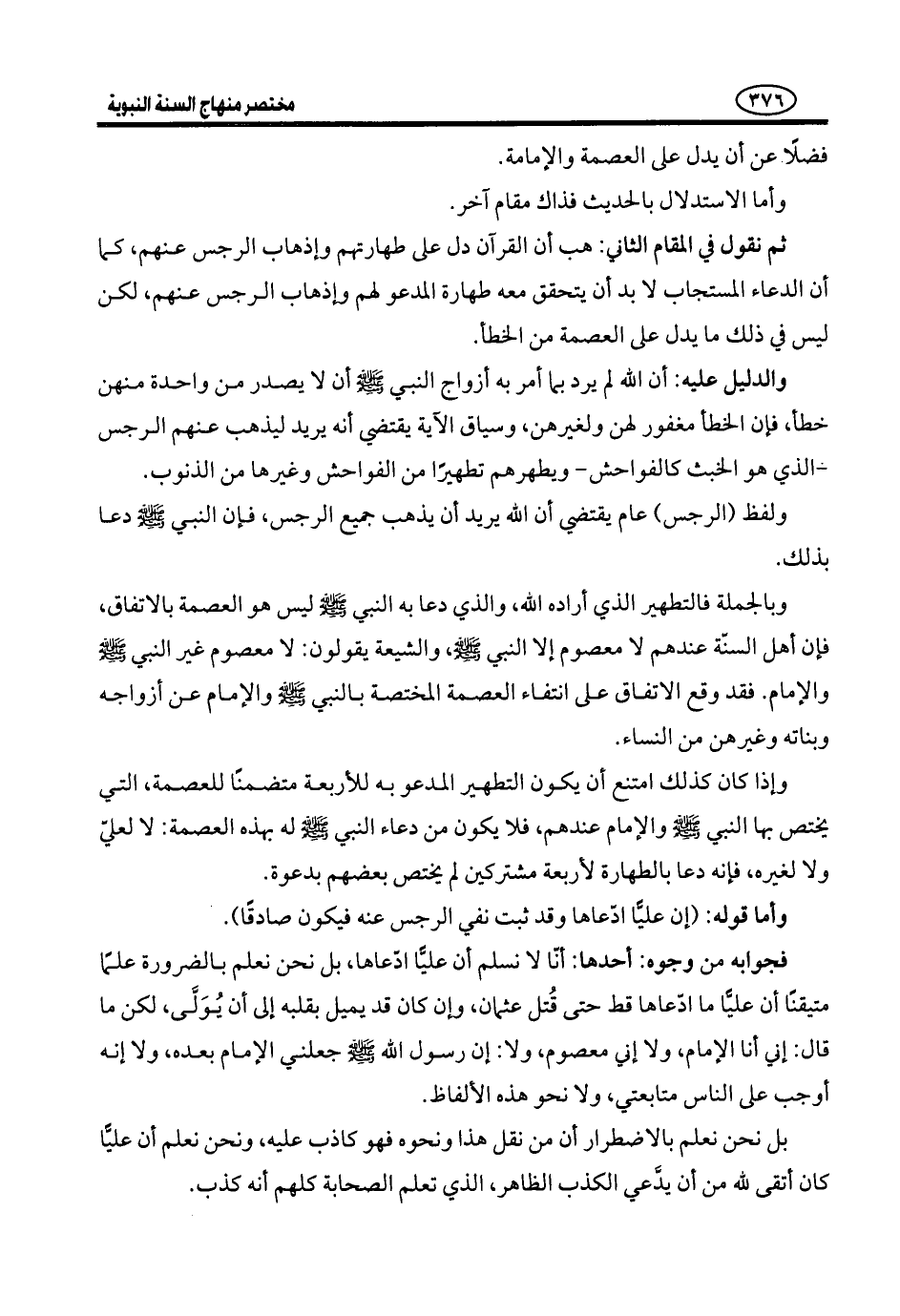 وَأَيْضًا فَنَحْنُ نَعْلَمُ أَنَّ عَلِيًّا كَانَ أَتْقَى لِلَّهِ مِنْ أَنْ يَتَعَمَّدَ الْكَذِبَ، كَمَا أَنَّ أَبَا بَكْرٍ وَعُمَرَ وَعُثْمَانَ وَغَيْرَهُمْ كَانُوا أَتْقَى لله من أن يتعمدوا الكذب. لَكِنْ لَوْ قِيلَ لِهَذَا الْمُحْتَجِّ بِالْآيَةِ: أَنْتَ لَمْ تَذْكُرْ دَلِيلًا عَلَى أَنَّ الْكَذِبَ مِنَ الرِّجْسِ، وَإِذَا لَمْ تَذْكُرْ عَلَى ذَلِكَ دَلِيلًا لَمْ يَلْزَمْ مِنْ إِذْهَابِ الرِّجْسِ إِذْهَابُ الْكِذْبَةِ الْوَاحِدَةِ، إِذَا قُدِّر أَنَّ الرِّجْسَ ذَاهِبٌ، فَهُوَ فِيمَنْ يَحْتَجُّ بِالْقُرْآنِ، وَلَيْسَ فِي الْقُرْآنِ مَا يَدُلُّ عَلَى إِذْهَابِ الرِّجْسِ، وَلَا مَا يَدُلُّ عَلَى أَنَّ الْكَذِبَ وَالْخَطَأَ مِنَ الرِّجْسِ، وَلَا أَنَّ عَلِيًّا قَالَ ذَلِكَ. وَلَكِنَّ هَذَا كُلَّهُ لَوْ صَحَّ شَيْءٌ مِنْهُ، لَمْ يَصِحَّ إِلَّا بِمُقَدِّمَاتٍ لَيْسَتْ فِي الْقُرْآنِ، فَأَيْنَ الْبَرَاهِينُ الَّتِي فِي الْقُرْآنِ عَلَى الْإِمَامَةِ؟ وَهَلْ يَدَّعِي هَذَا إِلَّا مَنْ هُوَ مِنْ أَهْلِ الْخِزْيِ وَالنَّدَامَةِ؟
