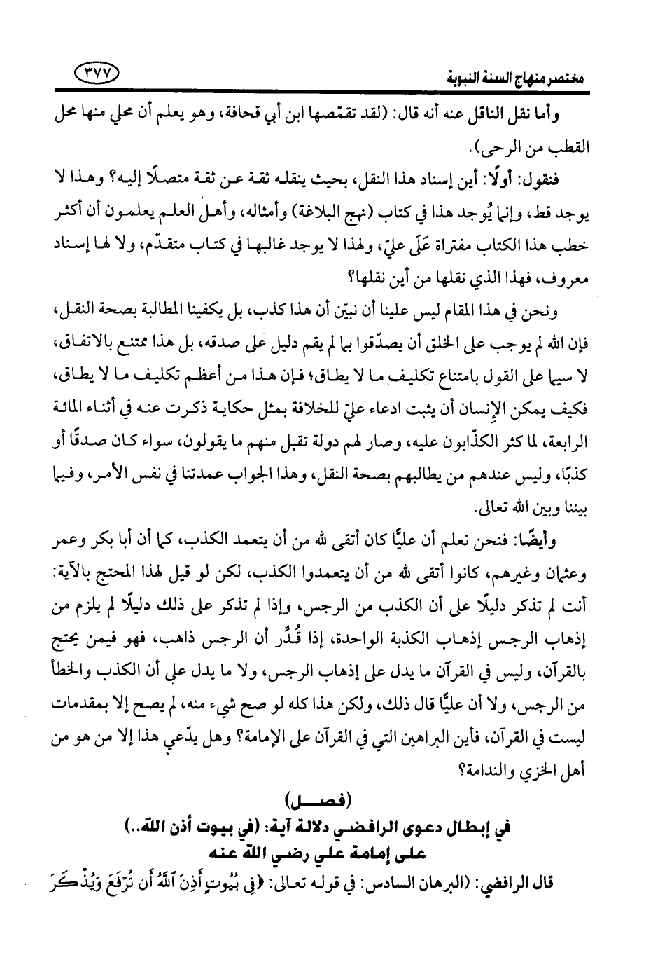 وَالْجَوَابُ مِنْ وُجُوهٍ: أَحَدُهَا: الْمُطَالَبَةُ بِصِحَّةِ هذا النقل. ومجرد عزو ذلك إِلَى الثَّعْلَبِيِّ لَيْسَ بِحُجَّةٍ بِاتِّفَاقِ أَهْلِ السُّنَّةِ والشيعة، وليس كل خبر رواه أحدٌ مِنَ الْجُمْهُورِ يَكُونُ حُجَّةً عِنْدَ الْجُمْهُورِ، بَلْ عُلَمَاءُ الْجُمْهُورِ مُتَّفِقُونَ عَلَى أَنَّ مَا يَرْوِيهِ الثَّعْلَبِيُّ وَأَمْثَالُهُ لَا يَحْتَجُّونَ بِهِ، لَا فِي فَضِيلَةِ أَبِي بَكْرٍ وَعُمَرَ، وَلَا فِي إِثْبَاتِ حُكْمٍ مِنَ الْأَحْكَامِ، إِلَّا أَنْ يُعلم ثُبُوتُهُ بِطَرِيقٍ، فَلَيْسَ لَهُ أَنْ يَقُولَ: إِنَّا نَحْتَجُّ عَلَيْكُمْ بِالْأَحَادِيثِ الَّتِي يَرْوِيهَا وَاحِدٌ مِنَ الْجُمْهُورِ، فَإِنَّ هَذَا بِمَنْزِلَةِ مَنْ يَقُولُ: أَنَا أَحْكُمُ عَلَيْكُمْ بِمَنْ يَشْهَدُ عَلَيْكُمْ مِنَ الْجُمْهُورِ، فَهَلْ يَقُولُ أَحَدٌ مِنْ عُلَمَاءِ الْجُمْهُورِ: إِنَّ كُلَّ مَنْ شَهِدَ مِنْهُمْ فَهُوَ عَدْلٌ، أَوْ قَالَ أَحَدٌ مِنْ عُلَمَائِهِمْ: إِنَّ كُلَّ مَنْ رَوَى مِنْهُمْ حَدِيثًا كَانَ صَحِيحًا.