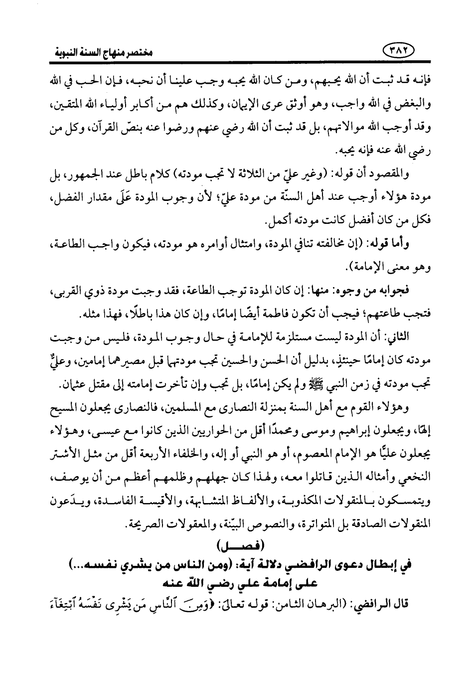 مَرْضَاتِ اللَّهِ} (¬1) . قَالَ الثَّعْلَبِيُّ: إِنَّ رَسُولَ اللَّهِ - صَلَّى اللَّهُ عَلَيْهِ وَسَلَّمَ - لَمَّا أَرَادَ الْهِجْرَةَ خَلَّفَ عَلِيَّ بْنَ أَبِي طَالِبٍ لِقَضَاءِ دُيُونِهِ وَرَدِّ الْوَدَائِعِ الَّتِي كَانَتْ عِنْدَهُ، وَأَمَرَهُ لَيْلَةَ خَرَجَ إِلَى الْغَارِ، وَقَدْ أَحَاطَ الْمُشْرِكُونَ بِالدَّارِ، أَنْ يَنَامَ عَلَى فِرَاشِهِ، فَقَالَ لَهُ: يَا عَلِيُّ اتَّشِحْ بِبُرْدِي الْحَضْرَمِيِّ الْأَخْضَرِ، وَنَمْ عَلَى فِرَاشِي، فَإِنَّهُ لَا يَخْلُصَ إِلَيْكَ مِنْهُمْ مَكْرُوهٌ إِنْ شَاءَ الله تَعَالَى، فَفَعَلَ ذَلِكَ، فَأَوْحَى اللَّهُ تَعَالَى إِلَى جِبْرِيلَ وَمِيكَائِيلَ أَنِّي قَدْ آخَيْتُ بَيْنَكُمَا، وَجَعَلْتُ عُمُرَ أَحَدِكُمَا أَطْوَلَ مِنَ عُمُرِ الْآخَرِ، فَأَيُّكُمَا يُؤْثِرُ صَاحِبَهُ بِالْحَيَاةِ؟ فَاخْتَارَ كِلَاهَمَا الْحَيَاةَ، فَأَوْحَى اللَّهُ إِلَيْهَا: أَلَا كُنْتُمَا مِثْلَ عَلِيِّ بْنِ أَبِي طَالِبٍ، آخَيْتُ بَيْنَهُ وَبَيْنَ مُحَمَّدٍ عَلَيْهِ الصَّلَاةُ وَالسَّلَامُ فَبَاتَ عَلَى فِرَاشِهِ يَفْدِيهِ بِنَفْسِهِ وَيُؤْثِرُهُ بِالْحَيَاةِ؟ اهْبِطَا إِلَى الْأَرْضِ فَاحْفَظَاهُ مِنْ عَدُّوِهِ. فَنَزَلَا، فَكَانَ جِبْرِيلُ عِنْدَ رَأْسِهِ، وَمِيكَائِيلُ عِنْدَ رِجْلَيْهِ، فَقَالَ جِبْرِيلُ: بخٍ بخٍ مَنْ مِثْلُكَ يَا ابْنَ أَبِي طَالِبٍ يُبَاهِي اللَّهُ بك الملائكة؟ فأنزل الله تعالى عَلَى رَسُولِهِ - صَلَّى اللَّهُ عَلَيْهِ وَسَلَّمَ - وَهُوَ مُتَوَجِّهٌ إِلَى الْمَدِينَةِ فِي شَأَنِ عَلِيٍّ: {وَمِنَ النَّاسِ مَن يَشْرِي نَفْسَهُ ابْتِغَاءَ مَرْضَاتِ اللَّهِ} (¬2) . وَقَالَ ابْنُ عَبَّاسٍ: إِنَّمَا نَزَلَتْ فِي عَلِيٍّ لَمَّا هَرَبَ النَّبِيِّ - صَلَّى اللَّهُ عَلَيْهِ وَسَلَّمَ - مِنَ الْمُشْرِكِينَ إلى الغار، وهذه فَضِيلَةُ لَمْ تَحْصُلْ لِغَيْرِهِ تَدُلُّ عَلَى أَفْضَلِيَّةِ عَلِيٍّ عَلَى جَمِيعِ الصَّحَابَةِ، فَيَكُونُ هُوَ الْإِمَامُ)) .