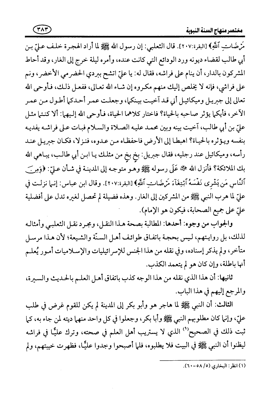 وَغَيْرُ وَاحِدٍ مِنَ الصَّحَابَةِ قَدْ فَدَاهُ بِنَفْسِهِ فِي مُوَاطِنِ الْحُرُوبِ، فَمِنْهُمْ مَنْ قُتل بَيْنَ يَدَيْهِ، وَمِنْهُمْ مَنْ شُلَّتْ يَدُهُ، كَطَلْحَةَ بن عبيد اللَّهِ. وَهَذَا وَاجِبٌ عَلَى الْمُؤْمِنِينَ كُلِّهِمْ. فَلَوْ قدِّر أَنَّهُ كَانَ هُنَاكَ فِدَاءٌ بِالنَّفْسِ لَكَانَ هَذَا مِنَ الْفَضَائِلِ الْمُشْتَرِكَةِ بَيْنَهُ وَبَيْنَ غَيْرِهِ مِنَ الصَّحَابَةِ، فَكَيْفَ إِذَا لَمْ يَكُنْ هُنَاكَ خوف عَلَى عليٍّ؟.