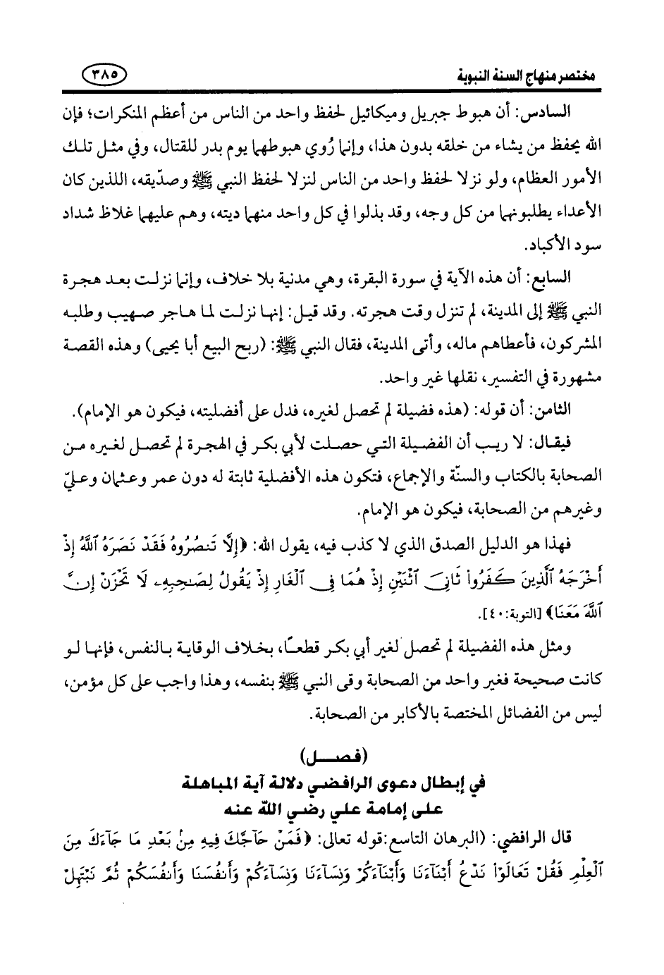 فَنَجْعَل لَّعْنَةَ اللَّهِ عَلَى الْكَاذِبِين} (¬1) . نَقَلَ الْجُمْهُورُ كَافَّةً أَنَّ ((أَبْنَاءَنَا)) إِشَارَةٌ إِلَى الْحَسَنِ وَالْحُسَيْنِ، وَ ((نِسَاءَنَا)) إِشَارَةٌ إِلَى فَاطِمَةَ. وَ ((أَنْفُسَنَا)) إِشَارَةٌ إِلَى عَلِيٍّ. وَهَذِهِ الْآيَةُ دَلِيلٌ عَلَى ثُبُوتِ الْإِمَامَةِ لِعَلِيٍّ لِأَنَّهُ تَعَالَى قد جعله نَفْسَ رَسُولِ اللَّهِ - صَلَّى اللَّهُ عَلَيْهِ وَسَلَّمَ -، وَالِاتِّحَادُ مُحَالٌ، فَيَبْقَى الْمُرَادُ بِالْمُسَاوَاةِ لَهُ الْوِلَايَةُ. وَأَيْضًا لَوْ كَانَ غَيْرُ هَؤُلَاءِ مُسَاوِيًا لَهُمْ وَأَفْضَلَ مِنْهُمْ فِي اسْتِجَابَةِ الدُّعَاءِ لِأَمْرِهِ تَعَالَى بأخذهم لِأَنَّهُ فِي مَوْضِعِ الْحَاجَةِ، وَإِذَا كَانُوا هُمُ الْأَفْضَلُ تَعَيَّنَتِ الْإِمَامَةُ فِيهِمْ. وَهَلْ تَخْفَى دَلَالَةُ هَذِهِ الْآيَةِ عَلَى الْمَطْلُوبِ إِلَّا عَلَى مَنِ استحوذ الشيطان عليه، وأخذ بمجامع قَلْبِهِ، وحُبّبت إِلَيْهِ الدُّنْيَا الَّتِي لَا يَنَالُهَا إِلَّا بِمَنْعِ أَهْلِ الْحَقِّ مِنْ حَقِّهِمْ؟))