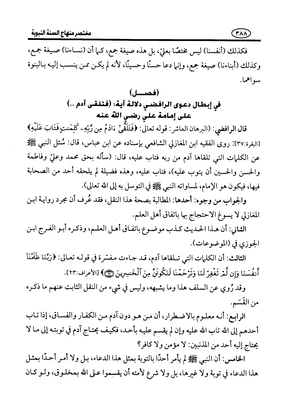 السَّابِعُ: أَنَّ هَذَا لَوْ كَانَ مَشْرُوعًا فَآدَمُ نَبِيٌّ كَرِيمٌ، كَيْفَ يُقْسِمُ عَلَى اللَّهِ بِمَنْ هُوَ أَكْرَمُ عَلَيْهِ مِنْهُ؟ وَلَا رَيْبَ أَنَّ نَبِيَّنَا - صَلَّى اللَّهُ عَلَيْهِ وَسَلَّمَ - أَفْضَلُ مِنْ آدَمَ، لَكِنَّ آدَمَ أفضل من عليّ وفاطمة وحسن وحسين.