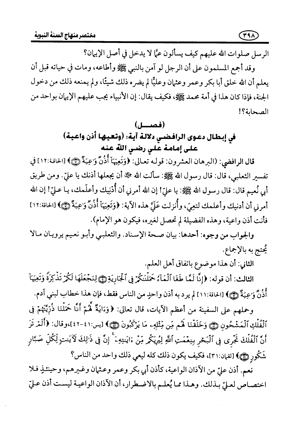 وَلَا رَيْبَ أَنَّ هَذَا الرَّافِضِيَّ الْجَاهِلَ الظَّالِمَ يَبْنِي أَمْرَهُ عَلَى مُقَدِّمَاتٍ بَاطِلَةٍ؛ فَإِنَّهُ لَا يُعلم فِي طَوَائِفِ أَهْلِ الْبِدَعِ أوْهَى مِنْ حُجَجِ الرَّافِضَةِ، بِخِلَافِ الْمُعْتَزِلَةِ وَنَحْوِهِمْ، فَإِنَّ لَهُمْ حُجَجًا وَأَدِلَّةً قد تشتبه على كثير من أهل العلم والعقل. وأما الرَّافِضَةُ فَلَيْسَ لَهُمْ حُجَّةٌ قَطُّ تَنْفُقُ إِلَّا عَلَى جَاهِلٍ أَوْ ظالمٍ صَاحِبِ هَوًى، يَقْبَلُ مَا يُوَافِقُ هَوَاهُ، سَوَاءٌ كَانَ حَقًّا أَوْ باطلا.
