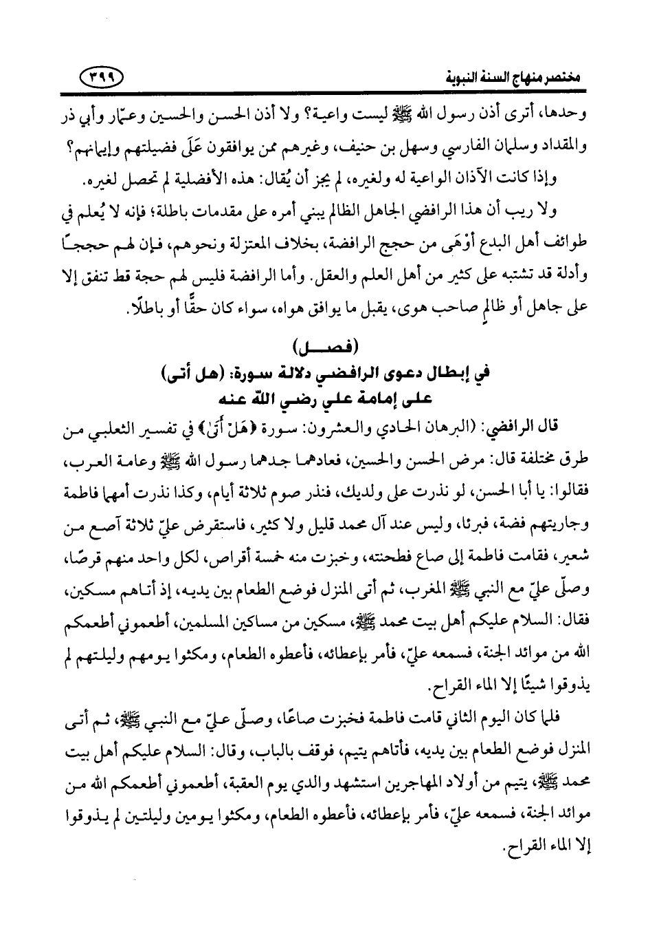 فَلَمَّا كَانَ الْيَوْمُ الثَّالِثُ قَامَتْ فَاطِمَةُ إِلَى الصَّاعِ الثَّالِثِ، فَطَحَنَتْهُ وَخَبَزَتْهُ، وَصَلَّى عَلِيٌّ مَعَ النَّبِيِّ - صَلَّى اللَّهُ عَلَيْهِ وَسَلَّمَ -، ثُمَّ أَتَى الْمَنْزِلَ فوُضع الطَّعَامُ بَيْنَ يَدَيْهِ، إِذْ أَتَى أَسِيرٌ فَقَالَ: أَتَأْسِرُونَنَا وَتُشَرِّدُونَنَا وَلَا تُطْعِمُونَنَا، أَطْعِمُونِي فَإِنِّي أَسِيرُ مُحَمَّدٍ أَطْعَمَكُمُ اللَّهُ مِنْ مَوَائِدِ الْجَنَّةِ. فَسَمِعَهُ عَلِيٌّ، فَأَمَرَ بِإِعْطَائِهِ، فَأَعْطَوْهُ الطَّعَامَ، وَمَكَثُوا ثَلَاثَةَ أَيَّامٍ بِلَيَالِيهَا لَمْ يَذُوقُوا شَيْئًا إِلَّا الْمَاءَ الْقَرَاحَ.