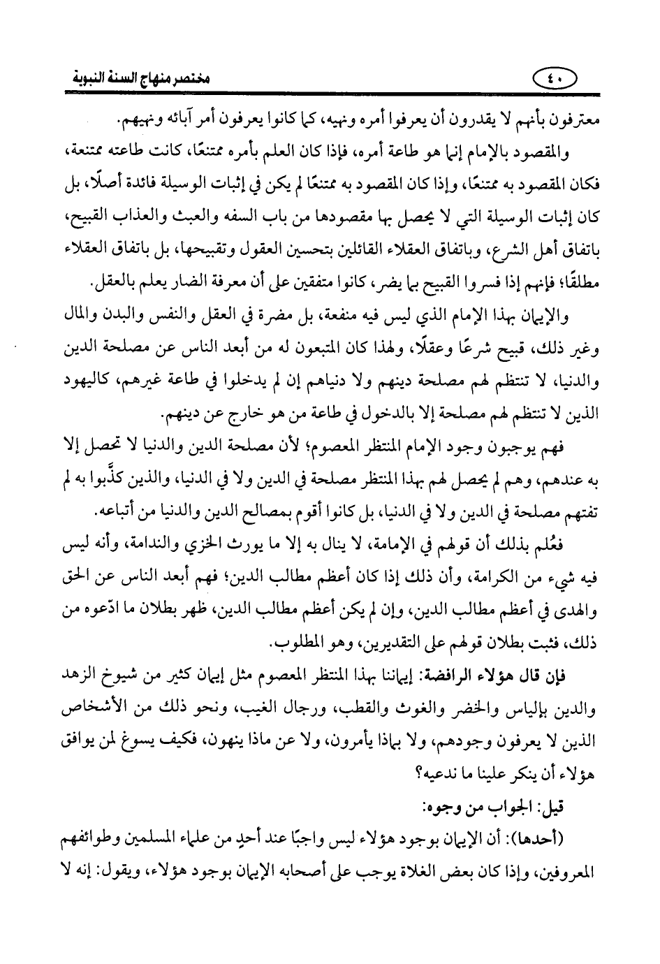 (الْوَجْهُ الثَّانِي) : أَنْ يُقَالَ مِنَ النَّاسِ مَنْ يَظُنُّ أَنَّ التَّصْدِيقَ بِهَؤُلَاءِ يزداد الرجل به إِيمَانًا وَخَيْرًا، وَمُوَالَاةً لِلَّهِ وَأَنَّ الْمُصَدِّقَ بِوُجُودِ هَؤُلَاءِ أَكْمَلُ وَأَشْرَفُ وَأَفْضَلُ عِنْدَ اللَّهِ مِمَّنْ لَمْ يُصَدِّقْ بِوُجُودِ هَؤُلَاءِ، وَهَذَا الْقَوْلُ لَيْسَ مِثْلَ قَوْلِ الرَّافِضَةِ مِنْ كُلِّ وَجْهٍ، بَلْ هُوَ مُشَابِهٌ لَهُ مِنْ بَعْضِ الْوُجُوهِ، لِكَوْنِهِمْ جَعَلُوا كَمَالَ الدَّيْنِ مَوْقُوفًا عَلَى ذَلِكَ.