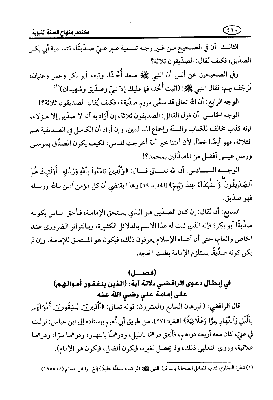 وَالْجَوَابُ مِنْ وُجُوهٍ: أَحَدُهَا: الْمُطَالَبَةُ بِصِحَّةِ النَّقْلِ. وَلَيْسَ هَذَا فِي مسند أحمد، ولا مجرد روايته له - ولو رَوَاهُ - فِي ((الْفَضَائِلِ)) يَدُلُّ عَلَى أَنَّهُ صِدْقٌ، فَكَيْفَ وَلَمْ يَرْوِهِ أَحْمَدُ: لَا فِي الْمُسْنَدِ، وَلَا فِي ((الْفَضَائِلِ)) وَإِنَّمَا هُوَ مِنْ زِيَادَاتِ القطيعي (¬1) .