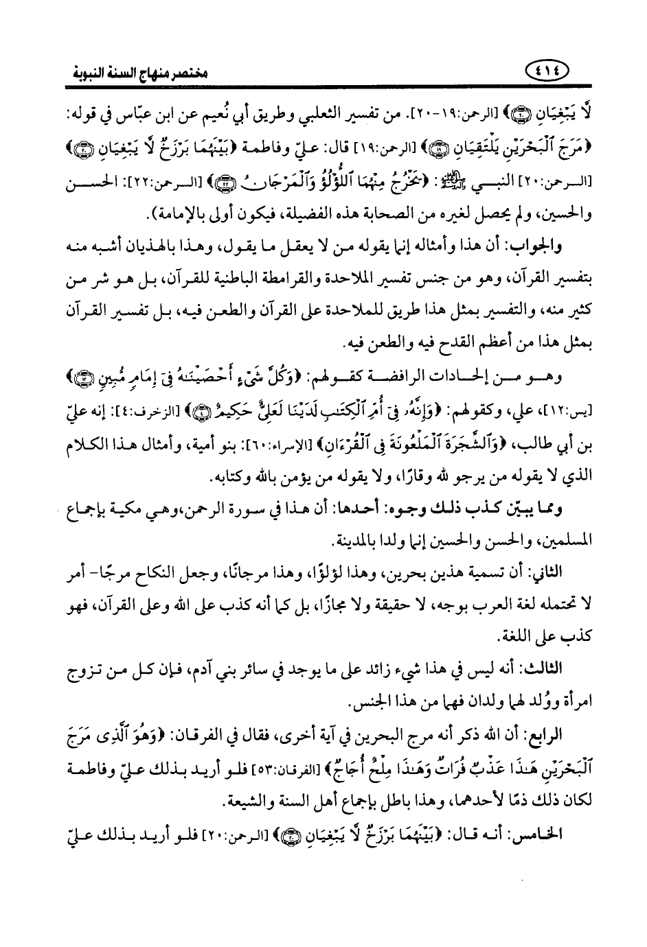 وفاطمة لكان البرزخ هُوَ النَّبِيُّ - صَلَّى اللَّهُ عَلَيْهِ وَسَلَّمَ - بِزَعْمِهِمْ - أَوْ غَيْرُهُ هُوَ الْمَانِعُ لِأَحَدِهِمَا أَنْ يَبْغِيَ عَلَى الْآخَرِ، وَهَذَا بِالذَّمِّ أَشْبَهُ مِنْهُ بِالْمَدْحِ.