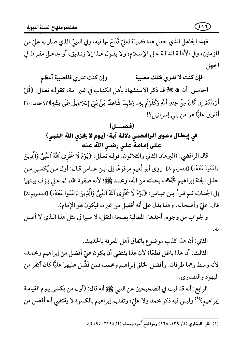 قَالَ الرَّافِضِيُّ: ((الْبُرْهَانُ الثَّالِثُ وَالثَّلَاثُونَ: قَوْلُهُ تَعَالَى: {إِنَّ الَّذِينَ آمَنُوا وَعَمِلُوا الصَّالِحَاتِ أُولَئِكَ هُمْ خَيْرُ الْبَرِيَّةَ} (¬3) . رَوَى الْحَافِظُ أَبُو نُعيم بِإِسْنَادِهِ إِلَى ابْنِ عَبَّاسٍ لَمَّا نَزَلَتْ هَذِهِ الْآيَةُ قَالَ رَسُولُ اللَّهِ - صَلَّى اللَّهُ عَلَيْهِ وَسَلَّمَ - لِعَلِيٍّ: تَأْتِي أَنْتَ وَشِيعَتُكُ يَوْمَ الْقِيَامَةِ رَاضِينَ مَرْضِيِّينَ، وَيَأْتِي خصماؤك غِضَابًا مُفْحَمِينَ، وَإِذَا كَانَ خَيْرُ الْبَرِيَّةِ، وَجَبَ أَنْ يَكُونَ هُوَ الْإِمَامَ)) .