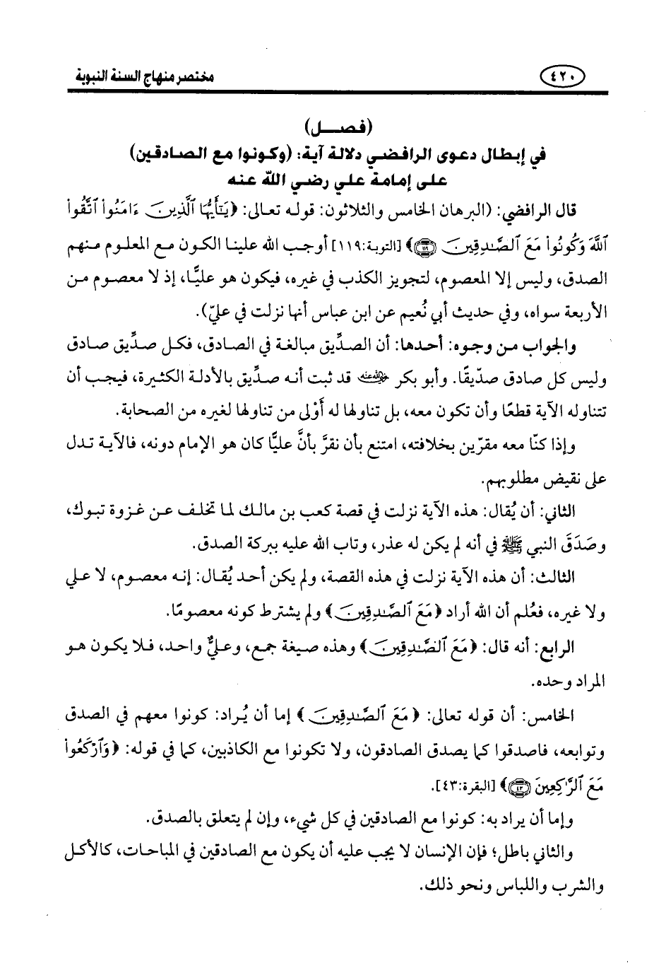 الوجه السابع: هب أن المراد: مع الْمَعْلُومِ فِيهِمُ الصِّدْقُ، لَكِنَّ الْعِلْمَ كَالْعِلْمِ فِي قوله: {فَإِنْ عَلِمْتُمُوهُنَّ مُؤْمِنَاتٍ} (¬1) ، وَالْإِيمَانُ أَخْفَى مِنَ الصِّدْقِ. فَإِذَا كَانَ الْعِلْمُ الْمَشْرُوطُ هُنَاكَ يُمْتَنَعُ أَنْ يُقال فِيهِ لَيْسَ: إِلَّا الْعِلْمُ بِالْمَعْصُومِ، كَذَلِكَ هُنَا يُمْتَنَعُ أَنْ يُقال: لَا يُعلم إِلَّا صِدْقُ الْمَعْصُومِ.