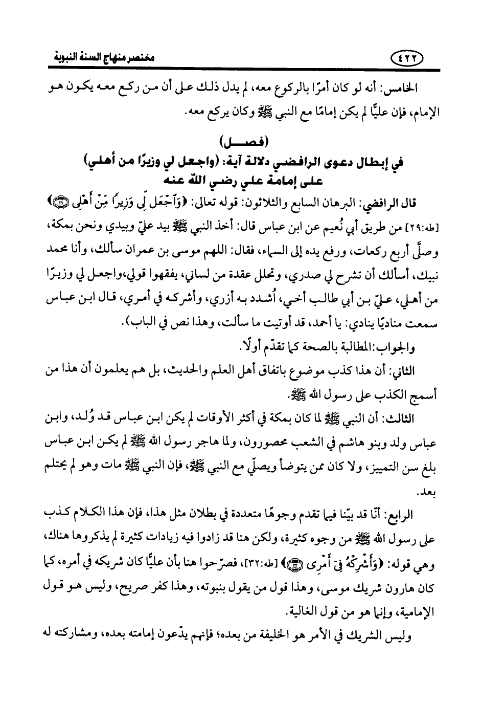 فَيُقَالُ لَهُ: يَا دُبَيْر هَذَا نَصٌّ فِي أَنَّ عَلِيًّا شَرِيكُهُ فِي أَمْرِهِ فِي حياته، كما كان هارون شريكا ً لِمُوسَى. فَهَلْ تَقُولُ بِمُوجَبِ هَذَا النَّصِّ؟ أَمْ تَرْجِعُ عَنِ الِاحْتِجَاجِ بِأَكَاذِيبِ الْمُفْتَرِينَ، وَتُرَّهَاتِ إِخْوَانِكَ المبطلين؟!