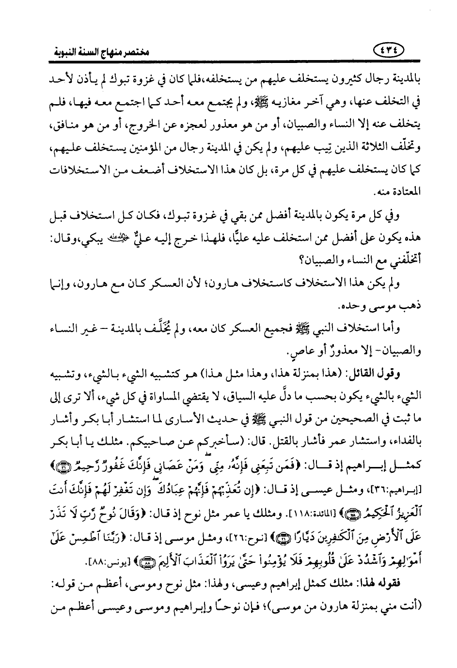وَقَوْلُ الْقَائِلِ: إِنَّهُ جَعَلَهُ بِمَنْزِلَةِ هَارُونَ فِي كُلِّ الْأَشْيَاءِ إِلَّا فِي النُّبُوَّةِ بَاطِلٌ؛ فَإِنَّ قَوْلَهُ: ((أَمَا تَرْضَى أَنْ تَكُونَ مِنِّي بِمَنْزِلَةِ هارون من موسى؟)) دَلِيلٌ عَلَى أَنَّهُ يَسْتَرْضِيهِ بِذَلِكَ وَيُطَيِّبُ قَلْبَهُ لِمَا تَوَهَّمَ مِنْ وَهَنِ الِاسْتِخْلَافِ وَنَقْصِ دَرَجَتِهِ، فَقَالَ هَذَا عَلَى سَبِيلِ الْجَبْرِ لَهُ.