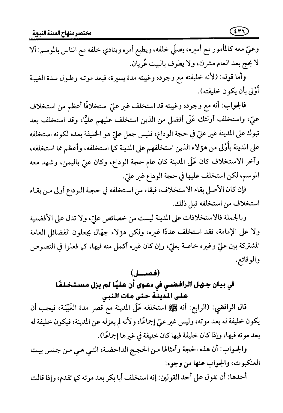 الرافضة: بل استخلف عليًّا. قيل: الرواندية مِنْ جِنْسِكُمْ قَالُوا: اسْتَخْلَفَ الْعَبَّاسَ، وَكُلُّ مَنْ كَانَ لَهُ عِلْمٌ بِالْمَنْقُولَاتِ الثَّابِتَةِ يَعْلَمُ أَنَّ الْأَحَادِيثَ الدَّالَّةَ عَلَى اسْتِخْلَافِ أحدٍ بَعْدَ مَوْتِهِ إنما تدل عَلَى اسْتِخْلَافِ أَبِي بَكْرٍ، لَيْسَ فِيهَا شَيْءٌ يَدُلُّ عَلَى اسْتِخْلَافِ عَلِيٍّ وَلَا الْعَبَّاسِ، بَلْ كُلُّهَا تَدُلُّ عَلَى أَنَّهُ لَمْ يَسْتَخْلِفْ وَاحِدًا مِنْهُمَا. فَيُقَالُ حِينَئِذٍ: إِنْ كَانَ النَّبِيُّ - صَلَّى اللَّهُ عَلَيْهِ وَسَلَّمَ - اسْتَخْلَفَ أَحَدًا فَلَمْ يَسْتَخْلِفْ إِلَّا أَبَا بَكْرٍ، وَإِنْ لَمْ يَسْتَخْلِفْ أَحَدًا فلا هذا ولا هذا.