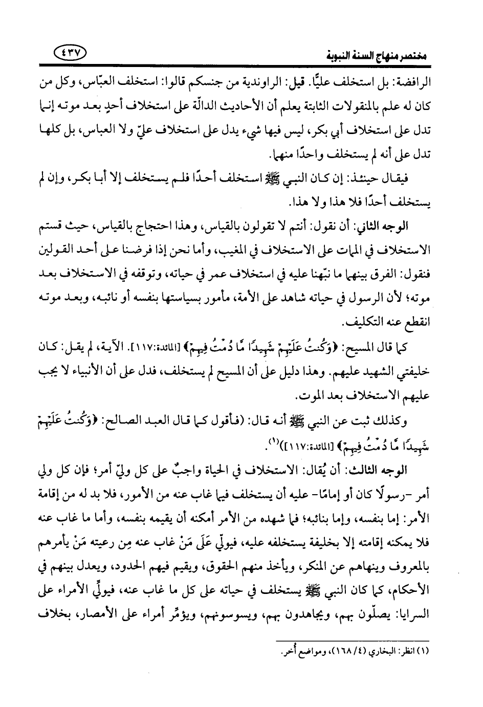 فعُلم أَنَّ تَرْكَ الِاسْتِخْلَافِ مِنَ النَّبِيِّ - صَلَّى اللَّهُ عَلَيْهِ وَسَلَّمَ - بَعْدَ الْمَوْتِ أَكْمَلُ فِي حَقِّ الرَّسُولِ مِنَ الِاسْتِخْلَافِ، وَأَنَّ مَنْ قَاسَ وُجُوبَ الِاسْتِخْلَافِ بَعْدَ الْمَمَاتِ عَلَى وُجُوبِهِ فِي الحياة كان من أجهل الناس.