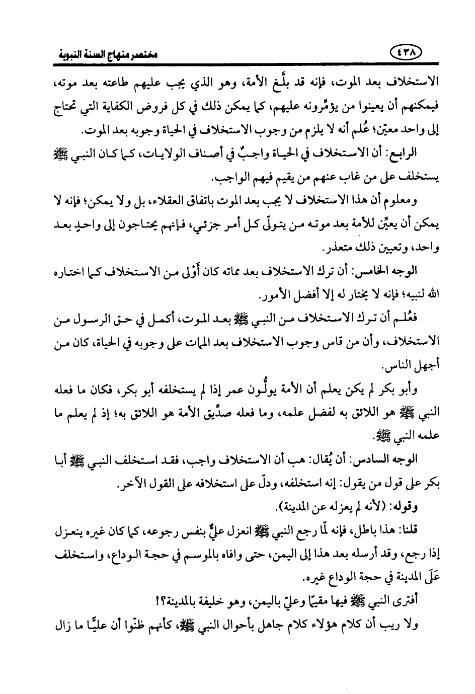 خَلِيفَةً عَلَى الْمَدِينَةِ حَتَّى مَاتَ النَّبِيُّ - صَلَّى اللَّهُ عَلَيْهِ وَسَلَّمَ -، وَلَمْ يَعْلَمُوا أَنَّ عَلِيًّا بَعْدَ ذَلِكَ أَرْسَلَهُ النَّبِيُّ - صَلَّى اللَّهُ عَلَيْهِ وَسَلَّمَ - سَنَةَ تِسْعٍ مَعَ أَبِي بَكْرٍ لِنَبْذِ الْعُهُودِ، وأمَّر عَلَيْهِ أَبَا بَكْرٍ. ثُمَّ بَعْدَ رُجُوعِهِ مَعَ أَبِي بَكْرٍ أَرْسَلَهُ إِلَى الْيَمَنِ، كما أرسل معاذاً وأبا موسى.