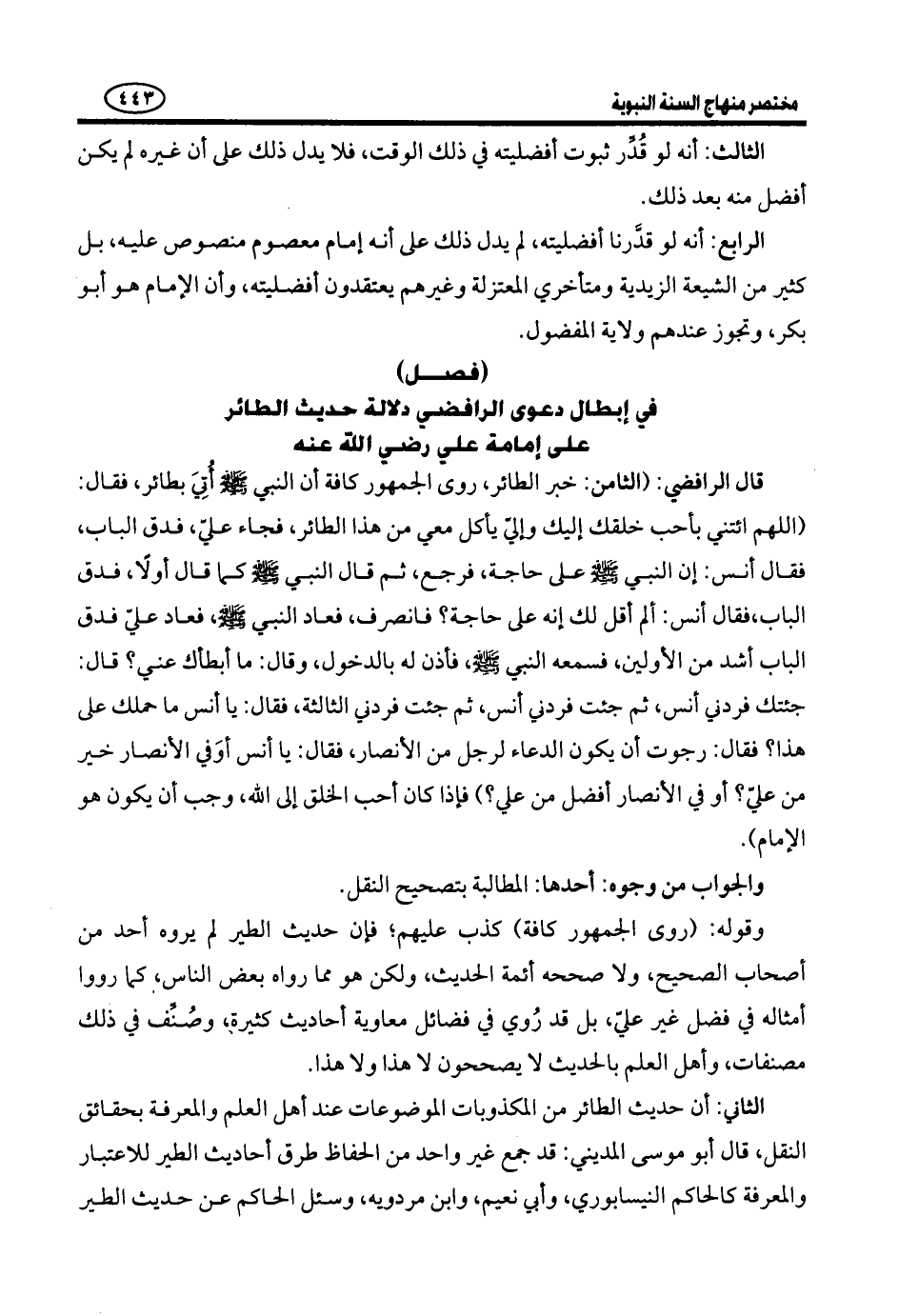 الرَّابِعُ: أَنَّ هَذَا الْحَدِيثَ يُنَاقِضُ مَذْهَبَ الرَّافِضَةِ؛ فَإِنَّهُمْ يَقُولُونَ: إِنَّ النَّبِيَّ - صَلَّى اللَّهُ عَلَيْهِ وَسَلَّمَ - كَانَ يَعْلَمُ أَنَّ عَلِيًّا أَحَبُّ الْخَلْقِ إِلَى اللَّهِ، وَأَنَّهُ جَعَلَهُ خَلِيفَةً مِنْ بَعْدِهِ. وَهَذَا الْحَدِيثُ يَدُلُّ عَلَى أَنَّهُ مَا كَانَ يَعْرِفُ أَحَبَّ الْخَلْقِ إِلَى اللَّهِ.