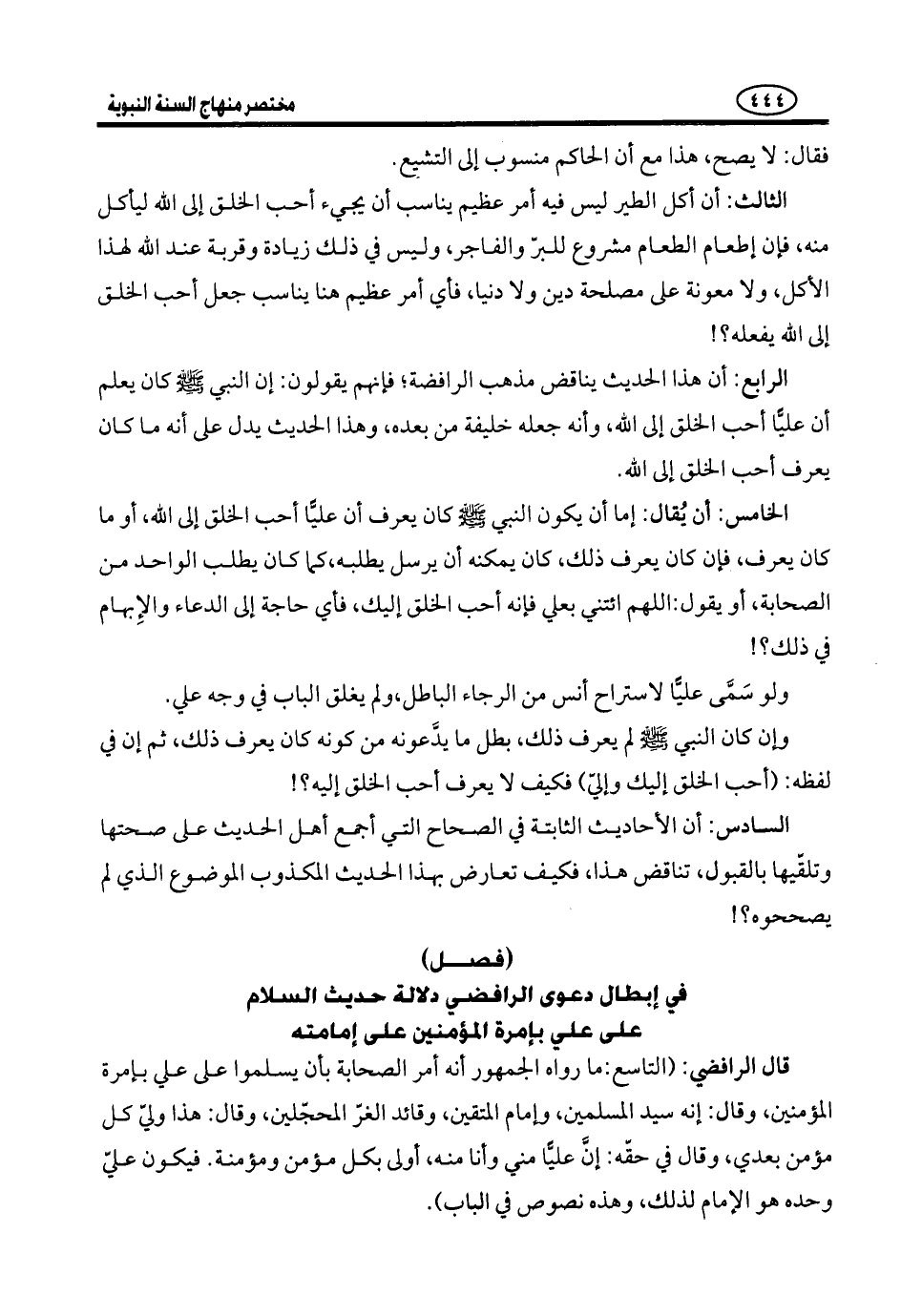 والجواب من وجوه: أحدها: المطالبة بإسناد وَبَيَانِ صِحَّتِهِ، وَهُوَ لَمْ يَعْزُهُ إِلَى كِتَابٍ عَلَى عَادَتِهِ. فَأَمَّا قَوْلُهُ: ((رَوَاهُ الْجُمْهُورُ)) فَكَذِبٌ، فَلَيْسَ هَذَا فِي كُتُبِ الْأَحَادِيثِ الْمَعْرُوفَةِ: لَا الصحاح، ولا المسانيد، وَلَا السُّنَنِ وَغَيْرِ ذَلِكَ. فَإِنْ كَانَ رَوَاهُ بَعْضُ حَاطِبِي اللَّيْلِ كَمَا يُروى أَمْثَالُهُ، فعِلْم مِثْلِ هَذَا لَيْسَ بِحُجَّةٍ يَجِبُ اتِّبَاعُهَا بِاتِّفَاقِ الْمُسْلِمِينَ.