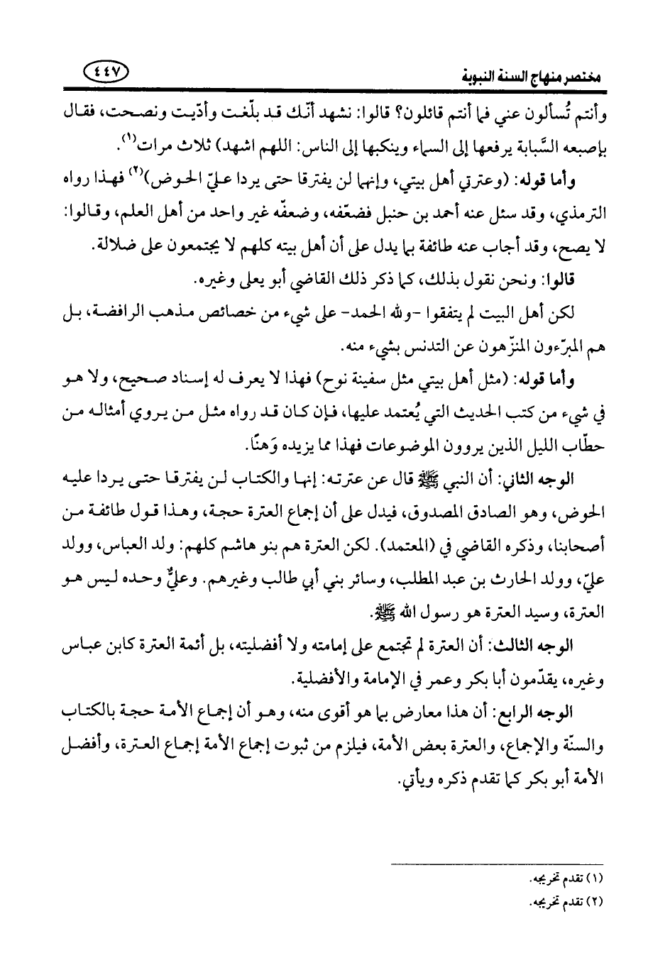 وَالْجَوَابُ مِنْ وُجُوهٍ: أَحَدُهَا: الْمُطَالَبَةُ بِتَصْحِيحِ النَّقْلِ، وَهَيْهَاتَ لَهُ بِذَلِكَ. وَأَمَّا قَوْلُهُ: ((رَوَاهُ أَحْمَدُ)) فَيُقَالُ: أَوَّلًا: أَحْمَدُ لَهُ الْمُسْنَدُ الْمَشْهُورُ، وَلَهُ كِتَابٌ مَشْهُورٌ فِي فَضَائِلِ الصَّحَابَةِ)) رَوَى فِيهِ أَحَادِيثَ، لَا يَرْوِيهَا فِي الْمُسْنَدِ لِمَا فِيهَا مِنَ الضَّعْفِ، لِكَوْنِهَا لَا تَصْلُحُ أَنْ تُروى فِي الْمُسْنَدِ، لِكَوْنِهَا من