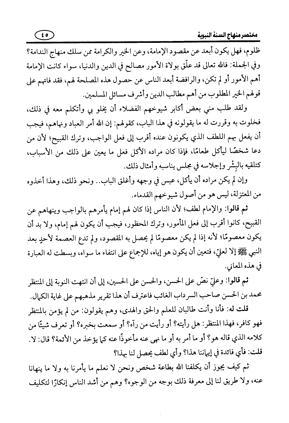 والذي عند الْإِمَامِيَّةُ مِنَ النَّقْلِ عَنِ الْأَئِمَّةِ الْمَوْتَى إِنْ كَانَ حَقًّا يَحْصُلُ بِهِ سَعَادَتُهُمْ فَلَا حَاجَةَ بِهِمْ إِلَى الْمُنْتَظَرِ، وَإِنْ كَانَ بَاطِلًا فَهُمْ أَيْضًا لَمْ يَنْتَفِعُوا بِالْمُنْتَظَرِ فِي رَدِّ هَذَا الْبَاطِلِ، فَلَمْ يَنْتَفِعُوا بِالْمُنْتَظَرِ لَا فِي إِثْبَاتِ حَقٍّ وَلَا فِي نَفْيِ بَاطِلٍ، وَلَا أَمْرٍ بِمَعْرُوفٍ وَلَا نَهْيٍ عَنْ مُنْكَرٍ، وَلَمْ يَحْصُلْ به لواحد منهم شيء من المصلحة واللطف والمنفعة المطلوبة مِنَ الْإِمَامَةِ.