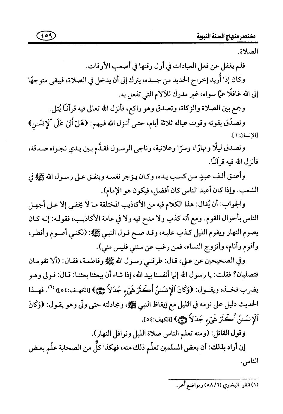 مِنَ الْكَذِبِ الَّذِي لَا مَدْحَ فِيهِ؛ فَإِنَّ النَّبِيَّ - صَلَّى اللَّهُ عَلَيْهِ وَسَلَّمَ - كَانَ مَجْمُوعُ صَلَاتِهِ فِي الْيَوْمِ وَاللَّيْلَةِ أَرْبَعِينَ رَكْعَةً: فَرْضًا وَنَفْلًا. وَالزَّمَانُ لَا يَتَّسِعُ لِأَلْفِ رَكْعَةٍ لِمَنْ وَلِيَ أَمْرَ الْمُسْلِمِينَ، مَعَ سِيَاسَةِ النَّاسِ وَأَهْلِهِ، إِلَّا أَنْ تَكُونَ صَلَاتُهُ نَقْرًا كَنَقْرِ الْغُرَابِ، وَهِيَ صَلَاةُ الْمُنَافِقِينَ الَّتِي نَزَّهَ اللَّهُ عَنْهَا عَلِيًّا.