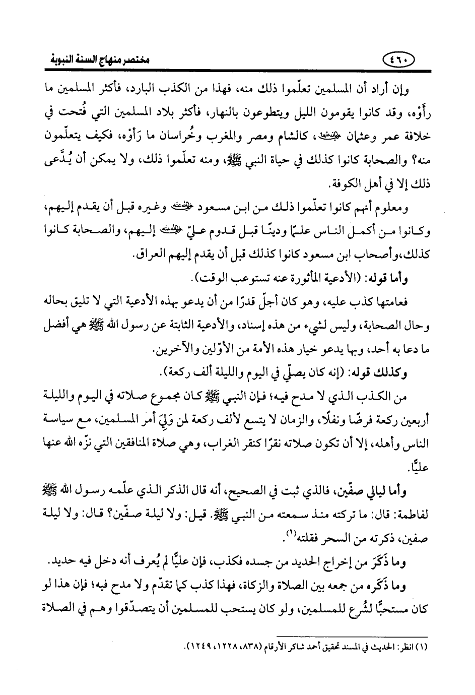 وَالْجَوَابُ: أَنَّ أَهْلَ السُّنَّةِ يَمْنَعُونَ ذَلِكَ وَيَقُولُونَ مَا اتَّفَقَ عَلَيْهِ عُلَمَاؤُهُمْ: إِنَّ أَعْلَمَ الناس بعد رسول الله أَبُو بَكْرٍ ثُمَّ عُمَرُ. وَقَدْ ذَكَرَ غَيْرُ وَاحِدٍ الْإِجْمَاعَ عَلَى أَنَّ أَبَا بَكْرٍ أَعْلَمُ الصحابة كلهم، ودلائل ذَلِكَ مَبْسُوطَةٌ فِي مَوْضِعِهَا؛ فَإِنَّهُ لَمْ يَكُنْ أحدٌ يَقْضِي وَيَخْطُبُ ويُفتى بِحَضْرَةِ النَّبِيِّ - صَلَّى اللَّهُ عَلَيْهِ وَسَلَّمَ - إِلَّا أَبُو بَكْرٍ رَضِيَ اللَّهُ عَنْهُ، وَلَمْ يَشْتَبِهْ عَلَى النَّاسِ شَيْءٌ مِنْ أَمْرِ دِينِهِمْ إِلَّا فَصَّلَهُ أَبُو بَكْرٍ؛ فَإِنَّهُمْ شَكُّوا فِي مَوْتِ النَّبِيِّ - صَلَّى اللَّهُ عَلَيْهِ وَسَلَّمَ - فَبَيَّنَهُ أَبُو بَكْرٍ، ثُمَّ شَكُّوا فِي مَدْفَنِهِ فَبَيَّنَهُ، ثُمَّ شَكُّوا فِي قِتَالِ مَانِعِي الزَّكَاةِ فَبَيَّنَهُ أَبُو بَكْرٍ، وَبَيَّنَ لَهُمُ النَّصَّ فِي قَوْلِهِ تَعَالَى: {لَتَدْخُلُنَّ الْمَسْجِدَ الْحَرَامَ