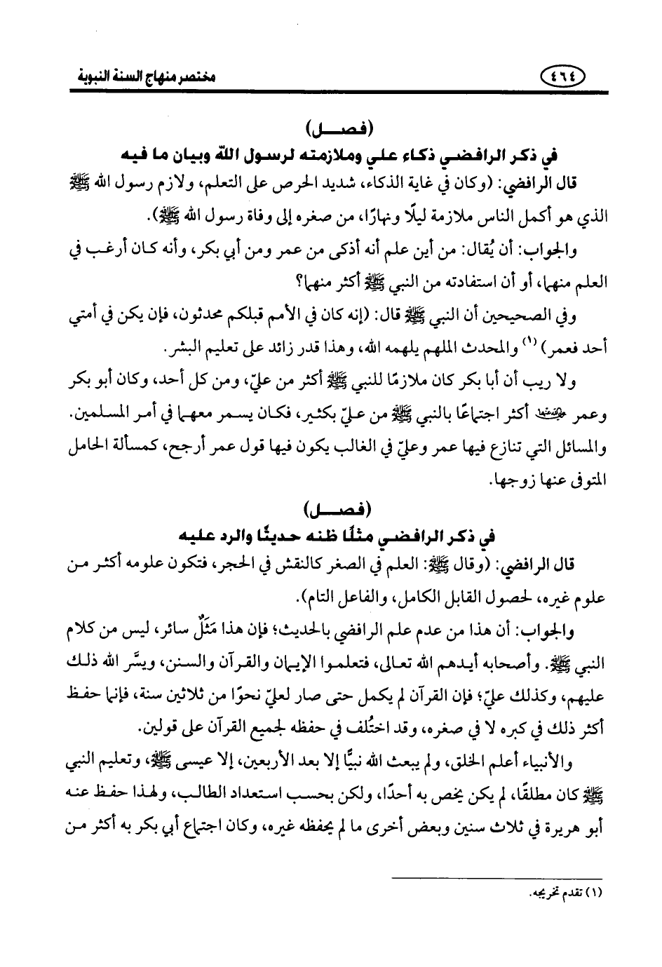 وَالْجَوَابُ: أَنْ يُقال: أَوَّلًا: هَذَا لَيْسَ مِنْ عُلُومِ النُّبُوَّةِ، وَإِنَّمَا هُوَ عِلْمٌ مُسْتَنْبَطٌ، وَهُوَ وَسِيلَةٌ فِي حِفْظِ قَوَانِينِ اللِّسَانِ، الَّذِي نَزَل بِهِ الْقُرْآنُ، وَلَمْ يَكُنْ فِي زَمَنِ الْخُلَفَاءِ الثَّلَاثَةِ لحنٌ، فَلَمْ يُحتَج إِلَيْهِ. فَلَمَّا سَكَنَ عليٌّ الْكُوفَةَ، وَبِهَا الْأَنْبَاطُ، رُوى أَنَّهُ قَالَ لِأَبِي الْأَسْوَدِ الدُّؤَلِيِّ: ((الْكَلَامُ اسْمٌ وَفِعْلٌ وَحَرْفٌ)) . وَقَالَ: ((انْحُ هَذَا النَّحْوَ)) فَفَعَلَ هَذَا لِلْحَاجَةِ. كَمَا أَنَّ مَنْ بَعْدَ عَلِيٍّ أَيْضًا اسْتَخْرَجَ لِلْخَطِّ النَّقْطَ وَالشَّكْلَ، وَعَلَامَةَ الْمَدِّ وَالشَّدِّ، وَنَحْوَهُ لِلْحَاجَةِ.
