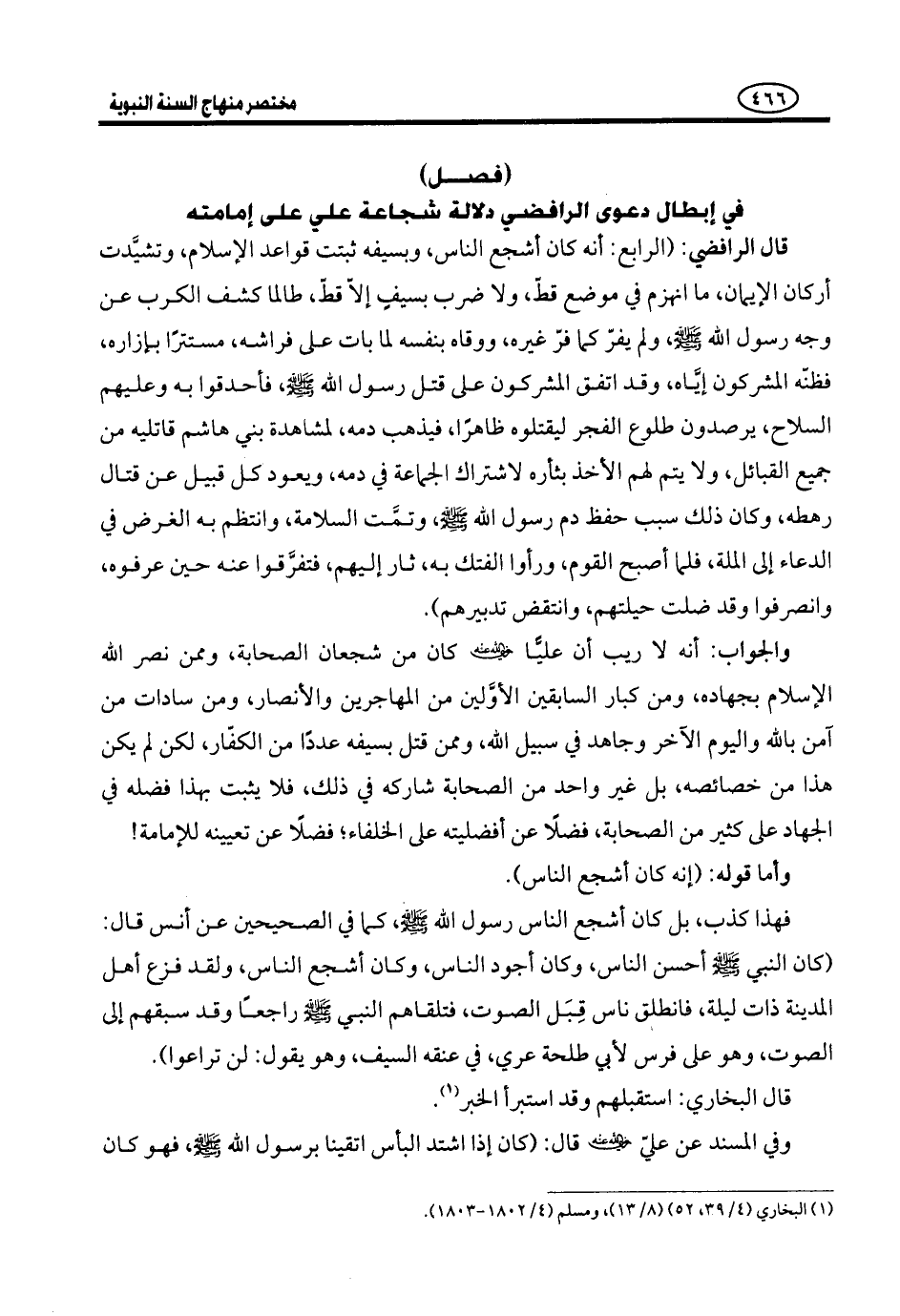 فَالشُّجَاعَةُ الْمَطْلُوبَةُ مِنِ الْإِمَامِ لَمْ تَكُنْ فِي أحدٍ بَعْدَ رَسُولِ اللَّهِ - صَلَّى اللَّهُ عَلَيْهِ وَسَلَّمَ - أَكْمَلَ مِنْهَا فِي أَبِي بَكْرٍ، ثُمَّ عُمَرَ. وَأَمَّا الْقَتْلُ فَلَا رَيْبَ أَنَّ غَيْرَ عَلِيٍّ مِنَ الصَّحَابَةِ قَتَلَ مِنَ الْكُفَّارِ أَكْثَرَ مِمَّا قَتَلَ عَلِيٌّ، فَإِنْ كَانَ مَنْ قَتَلَ أَكْثَرَ يَكُونُ أَشْجَعَ، فَكَثِيرٌ مِنَ الصَّحَابَةِ أَشْجَعُ مِنْ عَلِيٍّ، فَالْبَرَاءُ بْنُ مَالِكٍ - أَخُو أَنَسٍ - قَتَلَ مِائَةَ رَجُلٍ مُبَارَزَةً، غَيْرَ مَنْ شُورِكَ فِي دَمِهِ. وَأَمَّا خَالِدُ بْنُ الْوَلِيدِ فَلَا يُحْصِي عَدَدَ مَنْ قَتَلَهُ إِلَّا اللَّهُ، وَقَدِ انْكَسَرَ فِي يَدِهِ فِي غَزْوَةِ مُؤْتَةَ تِسْعَةُ أَسْيَافٍ، وَلَا رَيْبَ أَنَّهُ قَتَلَ أَضْعَافَ مَا قتله عليّ.