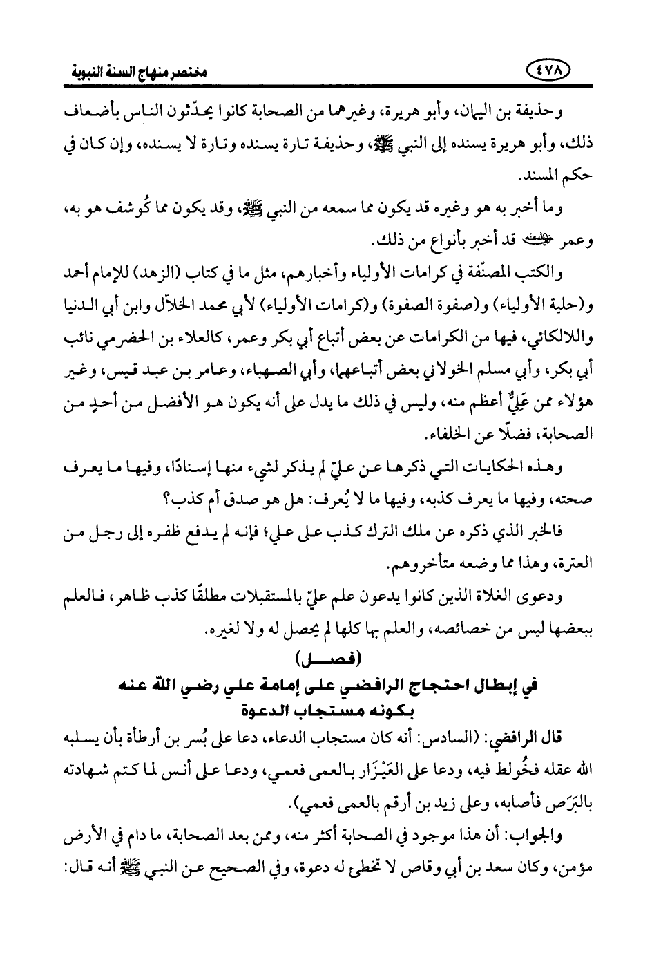 مَعَ أَنَّ هَذِهِ الْقِصَصَ الْمَذْكُورَةَ عَنْ عَلِيٍّ لَمْ يَذْكُرْ لَهَا إِسْنَادًا، فَتَتَوَقَّفُ عَلَى مَعْرِفَةِ الصِّحَّةِ، مَعَ أَنَّ فِيهَا مَا هُوَ كَذِبٌ لَا رَيْبَ فِيهِ، كَدُعَائِهِ عَلَى أَنَسٍ بالبَرَص، وَدُعَائِهِ عَلَى زَيْدِ بْنِ أَرْقَمَ بِالْعَمَى.