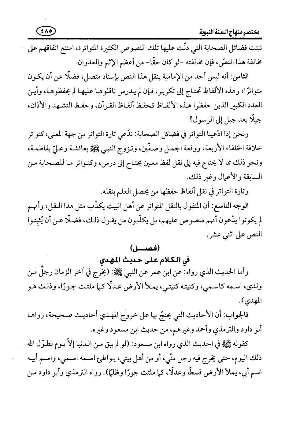 الثَّانِي: أَنَّ الِاثْنَيْ عَشْرِيَّةَ الَّذِينَ ادَّعَوْا أَنَّ هَذَا هُوَ مَهْدِيهِمْ، مَهْدِيهِمُ اسْمُهُ مُحَمَّدُ بْنُ الْحَسَنِ. وَالْمَهْدِيُّ المنعوت الذي وصفه النَّبِيُّ - صَلَّى اللَّهُ عَلَيْهِ وَسَلَّمَ - اسْمُهُ مُحَمَّدُ بْنُ عَبْدِ الله.