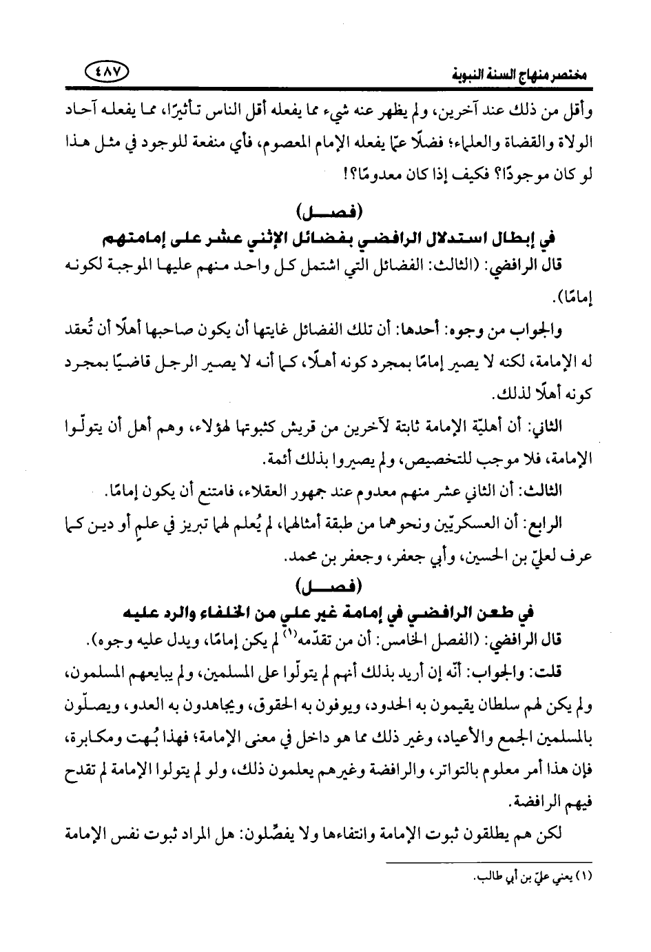 وَيُطْلِقُونَ لَفْظَ ((الْإِمَامِ)) عَلَى الثَّانِي، وَيُوهِمُونَ أَنَّهُ يَتَنَاوَلُ النوعين. وَإِنْ أُريد بِذَلِكَ أَنَّهُمْ لَمْ يَكُونُوا يَصْلُحُونَ لِلْإِمَامَةِ، وَأَنَّ عَلِيًّا كَانَ يَصْلُحُ لَهَا دُونَهُمْ، أَوْ أَنَّهُ كَانَ أَصْلَحَ لَهَا مِنْهُمْ - فَهَذَا كَذِبٌ، وَهُوَ مَوْرِدُ النِّزَاعِ.
