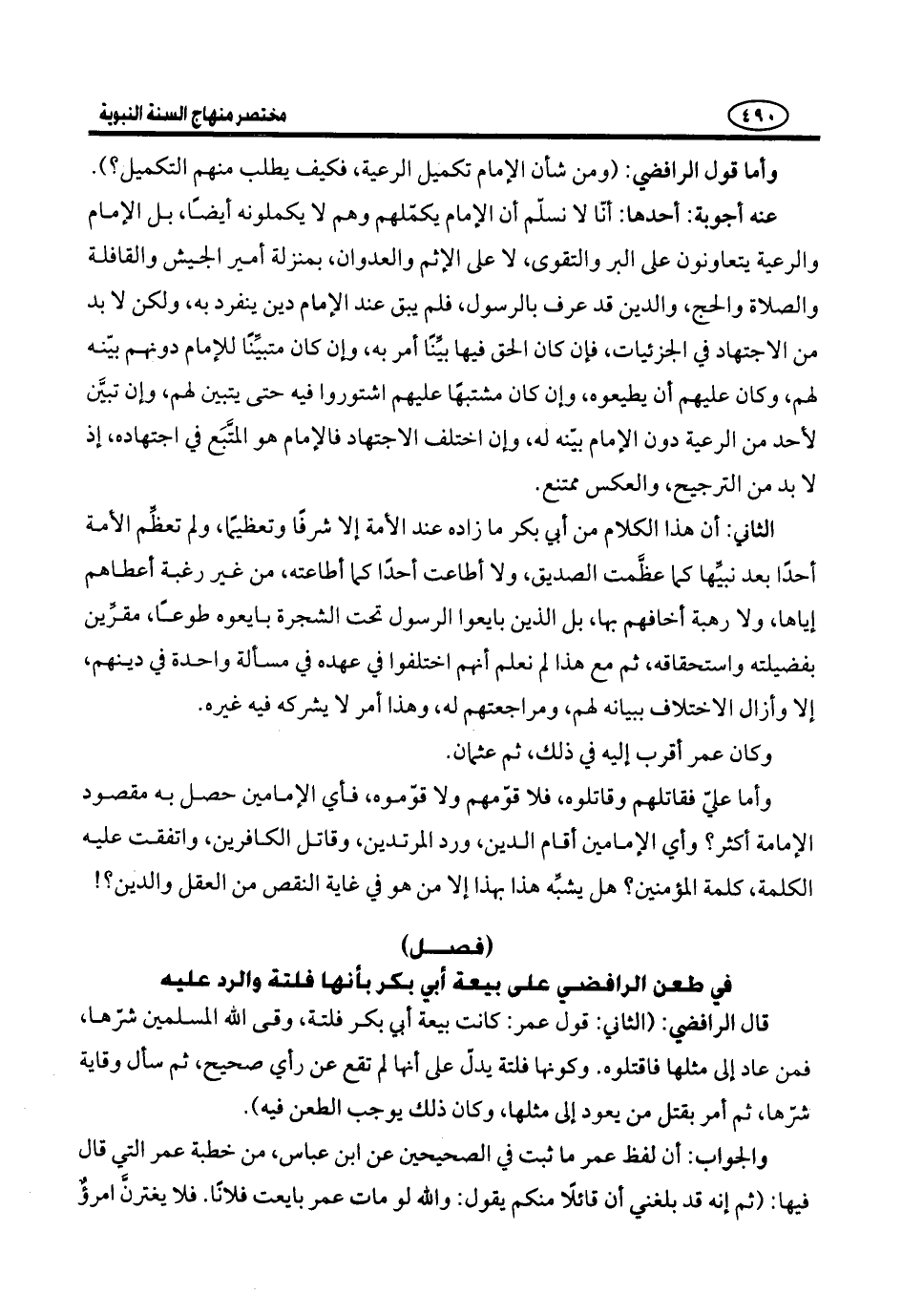 وَالْجَوَابُ: أَنَّ هَذَا مِنْ أَعْظَمِ الْبُهْتَانِ. أَمَّا أَبُو بَكْرٍ فَمَا عُرف أَنَّهُ اسْتَفَادَ مِنْ عَلِيٍّ شَيْئًا أَصْلًا. وعليٌّ قَدْ رَوَى عَنْهُ وَاحْتَذَى حَذْوَهُ وَاقْتَدَى بِسِيرَتِهِ. وَأَمَّا عُمَرُ فَقَدِ اسْتَفَادَ عليٌّ مِنْهُ أَكْثَرَ مِمَّا اسْتَفَادَ عُمَرُ مِنْهُ. وَأَمَّا عُثْمَانُ فَقَدْ كَانَ أَقَلَّ عِلْمًا مِنْ أَبِي بَكْرٍ وَعُمَرَ، وَمَعَ هَذَا فَمَا كَانَ يَحْتَاجُ إِلَى عَلِيٍّ، حَتَّى أَنَّ بَعْضَ النَّاسِ شَكَا إِلَى عَلِيٍّ بَعْضَ سُعَاةِ عُمَّالِ عُثْمَانَ، فَأَرْسَلَ إِلَيْهِ بِكِتَابِ الصَّدَقَةِ، فَقَالَ عُثْمَانُ: لَا حَاجَةَ لَنَا بِهِ.