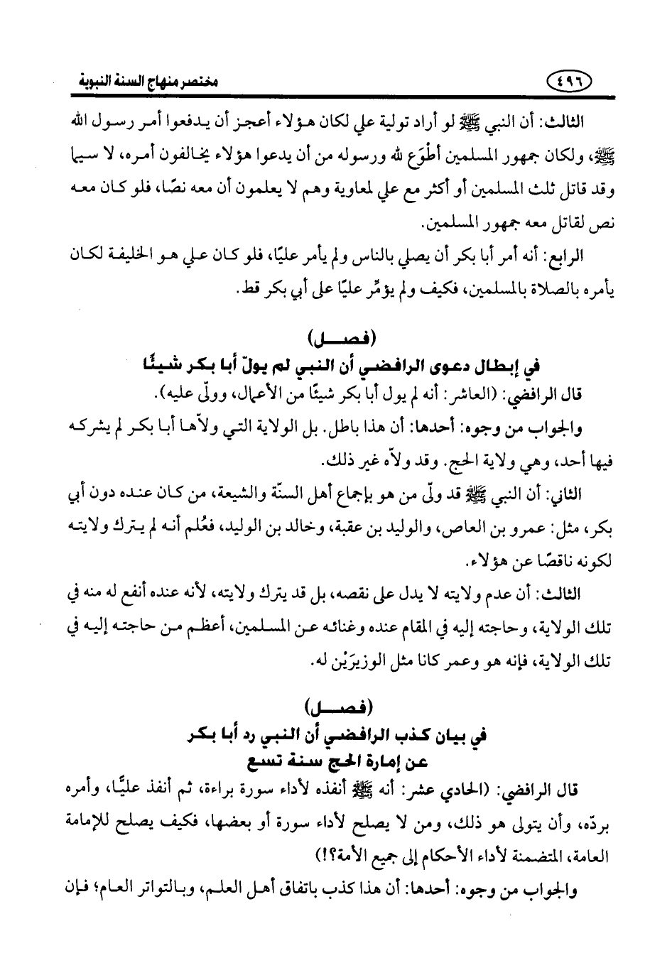 النَّبِيَّ - صَلَّى اللَّهُ عَلَيْهِ وَسَلَّمَ - اسْتَعْمَلَ أَبَا بكر على الحج سنة تسع، ولم يَرُدَّهُ وَلَا رَجَعَ، بَلْ هُوَ الَّذِي أَقَامَ لِلنَّاسِ الْحَجَّ ذَلِكَ الْعَامَ، وعليٌّ مِنْ جُمْلَةِ رَعِيَّتِهِ: يُصَلِّي خَلْفَهُ، وَيَدْفَعُ بِدَفْعِهِ، وَيَأْتَمِرُ بِأَمْرِهِ كَسَائِرِ مَنْ مَعَهُ.