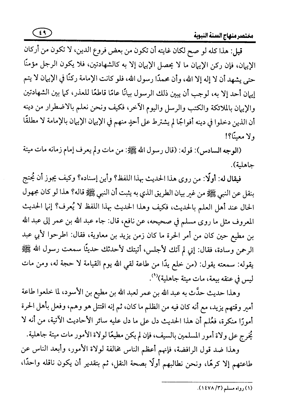 (الْوَجْهُ السَّابِعُ) : أَنْ يُقَالَ إِنْ كَانَ هَذَا الحديث من كلام النبي صلى الله تعالى عليه وسلم فَلَيْسَ فِيهِ حُجَّةٌ لِهَذَا الْقَائِلِ، فَإِنَّ النَّبِيَّ صَلَّى اللَّهُ تَعَالَى عَلَيْهِ وَسَلَّمَ قد قال مات ميتة جَاهِلِيَّةٌ.