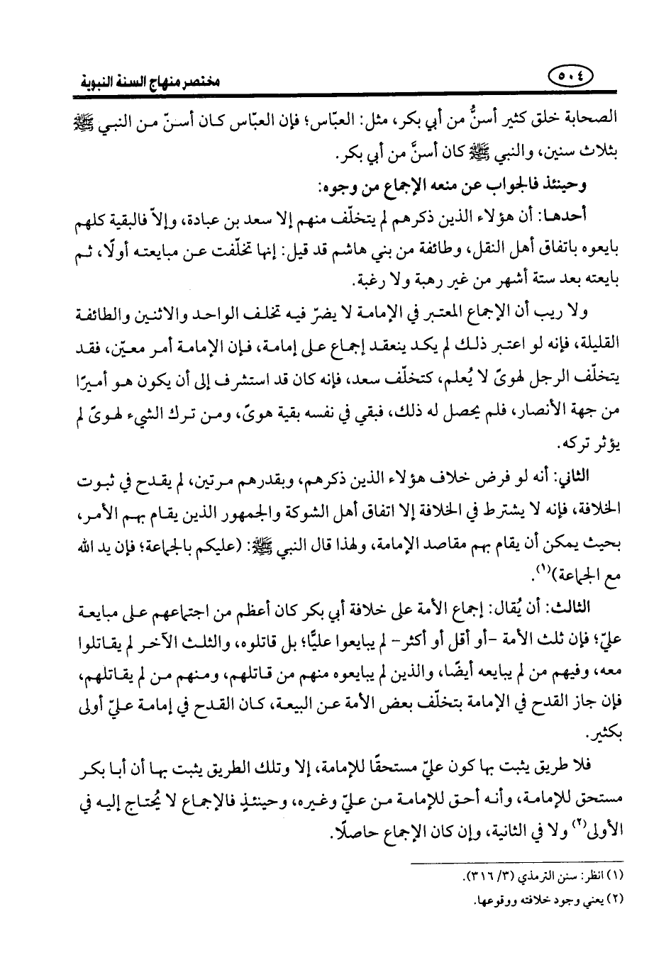 فَيُقَالُ لَهُمْ: إِنْ لَمْ يَكُنِ الْإِجْمَاعُ حُجَّةً، فَقَدْ بَطَلَتْ تِلْكَ الْحُجَجُ، فَبَطَلَ مَا بَنَوْهُ عَلَى الْإِجْمَاعِ مِنْ أُصُولِهِمْ، فَبَطَلَ قَوْلُهُمْ. وَإِذَا بَطَلَ ثَبَتَ مَذْهَبُ أَهْلِ السُّنَّةِ.
