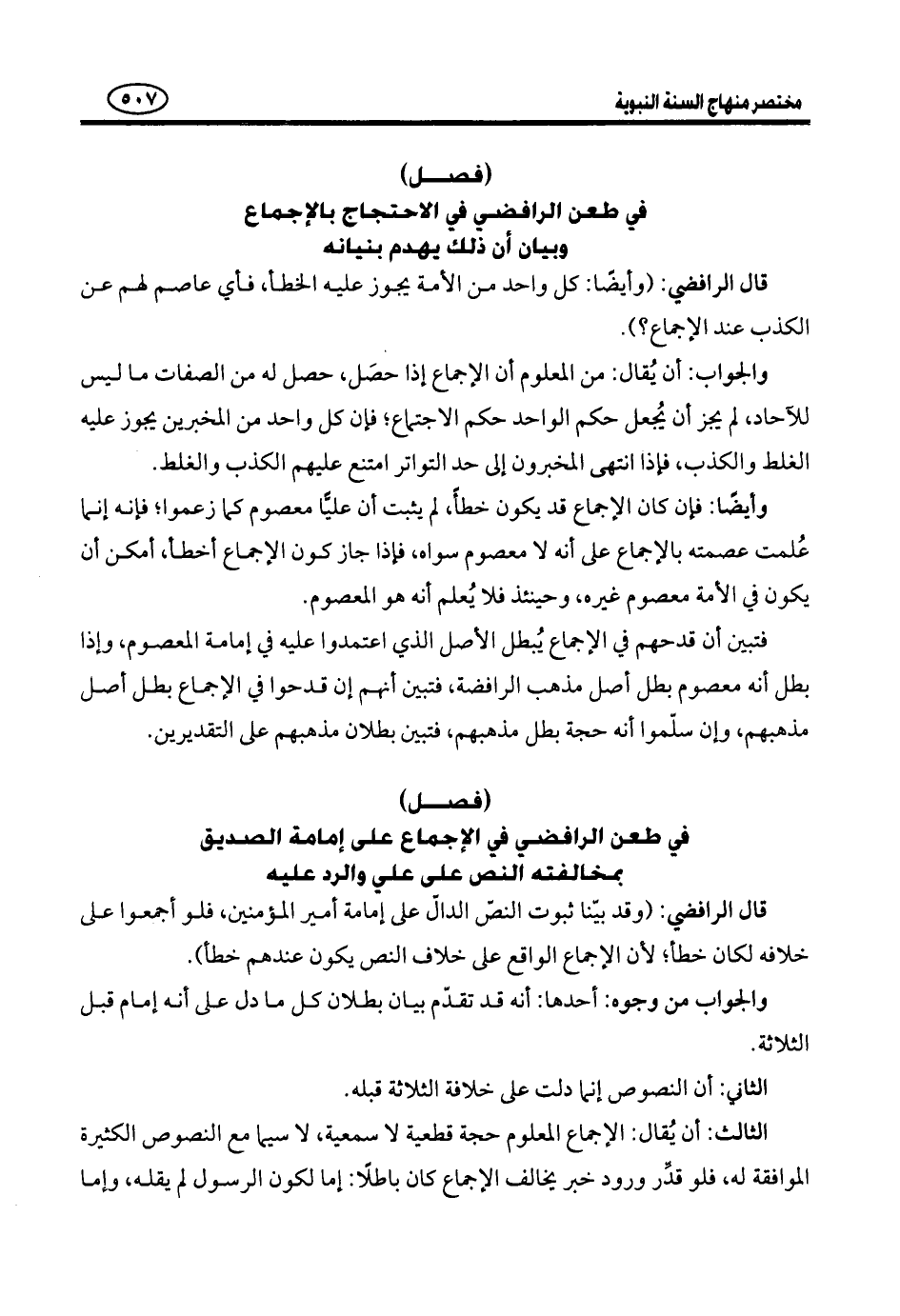 وَقَدْ دَلَّ الْإِجْمَاعُ الْمَعْلُومُ وَالنَّصُّ الْمَعْلُومُ عَلَى خلافة الصدّيق رضي الله عنه وبطلان غيرهما. وَنَصُّ الرَّافِضَةِ مِمَّا نَحْنُ نَعْلَمُ كَذِبَهُ بِالِاضْطِرَارِ، وعلى كذبه أدلة كثيرة.